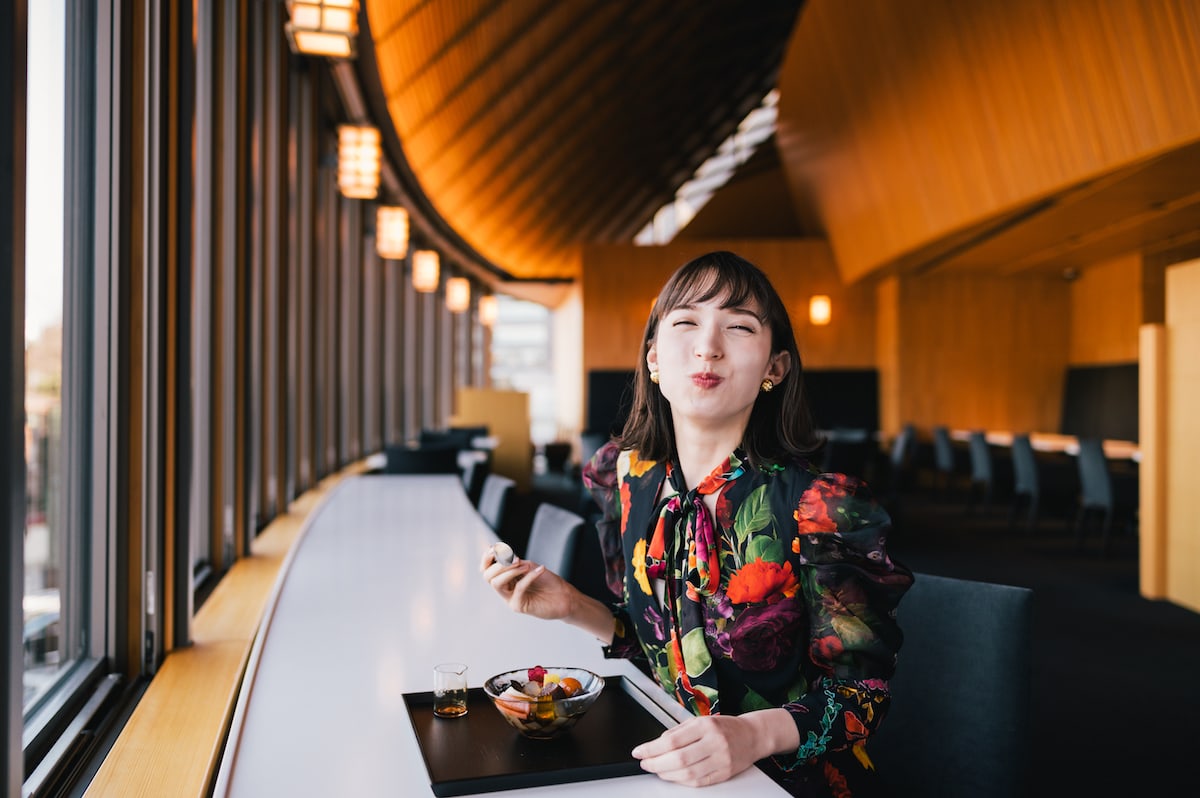 見た目に美しく、触れて心地よく、そして香しい店内。今回は、モデルでありカフェライターとしても活躍中の斉藤アリスさんに『とらや赤坂店』でのひとときを過ごしていただきました。