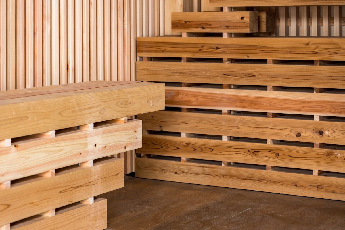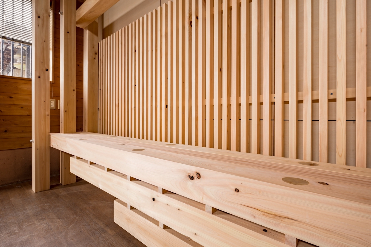 木村:入ってすぐの左側には吉野ヒノキを、正面には吉野スギを使うことにして木材の違いをわかりやすく配置。美しい木材ですから短く切って使うのではなく、できるだけ長い面を見せられるように工夫しました。僕が初めて吉野町にお邪魔した2019年の春に、吉野の山や製材所などにも連れて行っていただいて、その時に板と板を直接重ねずに、風が通るように小さな角材を置いて、何段にも重ねる木材の乾燥方法を拝見したんです。それがヒントになり、板と板の間に小さな角材を入れるデザインを考えました。