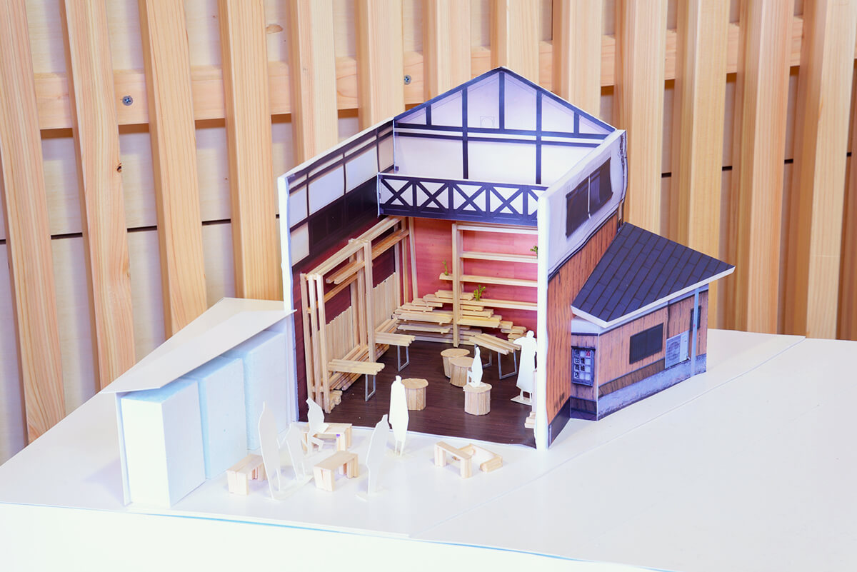 ワークショップでは、リノベーション後の使用目的について話し合い、地域住民からは、イベントなどの打ち上げ、パブリックビューイング、ライブ会場などのリクエストが挙げられました。これを受けた9名の学生たちは、地域住民の方々が思い思いの様々な用途で使用できるようにという想いを込めて、中央部に空間をつくり、広く見せるデザインを提案。