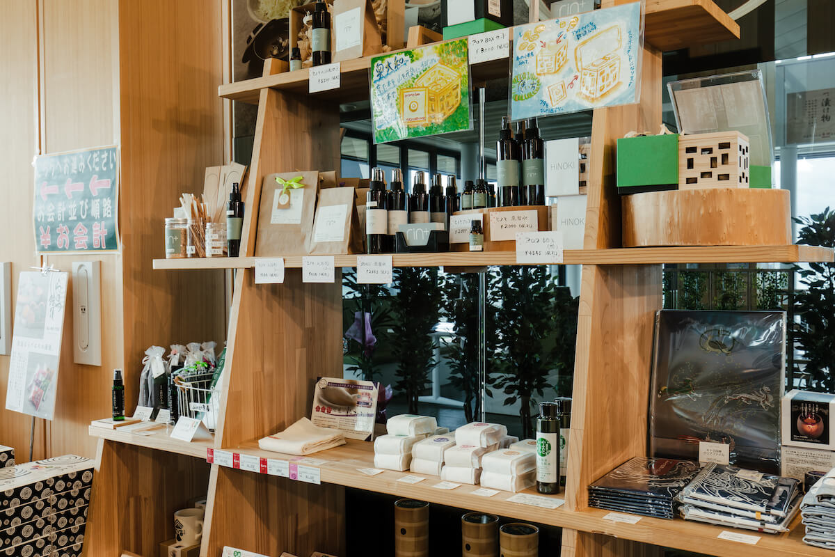 農産物エリアには、地元でとれた野菜や果物、奈良の食材を使った加工品のほか、奈良県産のヒノキや黒文字を原料にしたアロマオイルやスプレー、入浴剤などの奈良の木グッズも販売されています。