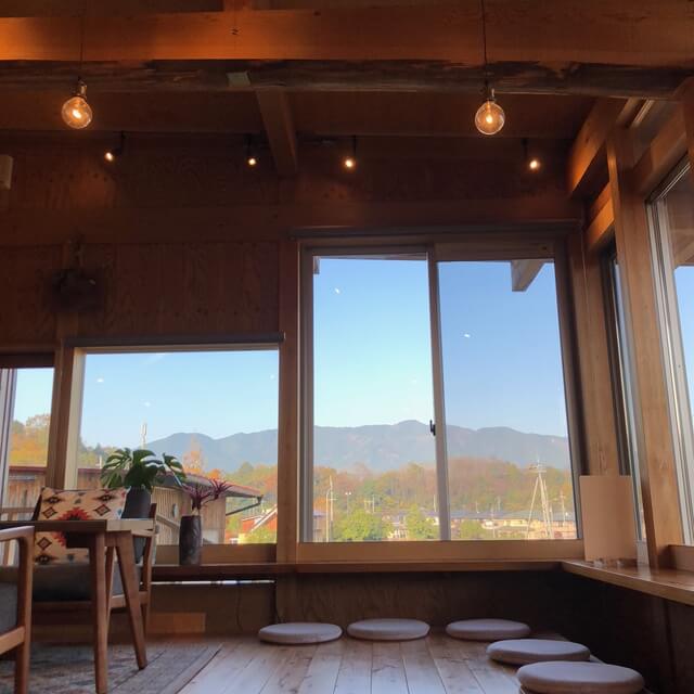 木の温かみを感じる店内の大きな窓からは、吉野の豊かな自然が見渡せます。自然たっぷりの風景を眺めながら、のんびりと美味しい食事やお茶を楽しんでみては?