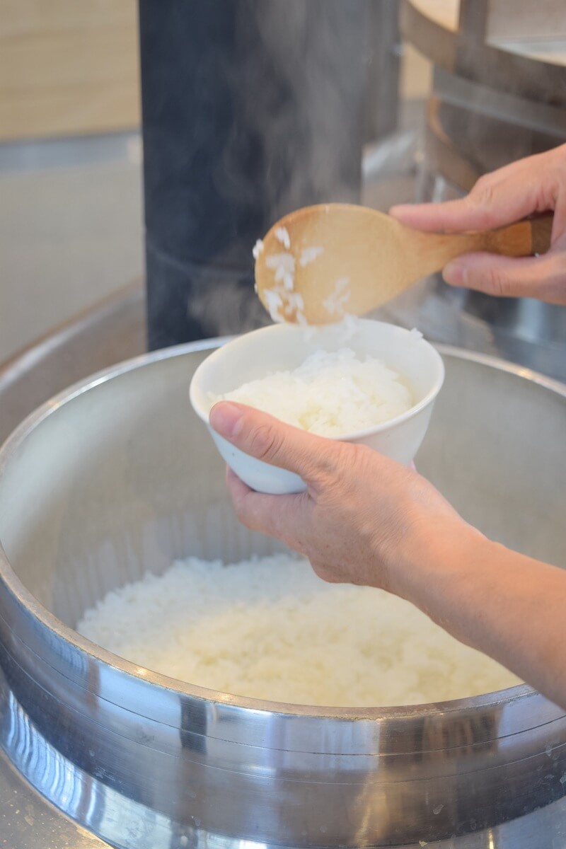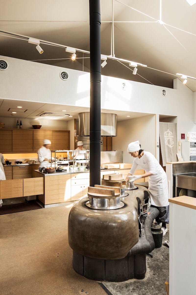 一番の魅力は、伝統的なかまどで炊いた美味しいごはんを食べられること。奈良県産のお米を使用し、かまどにくべる薪にも奈良・吉野の桧が使われるなど地産地消へのこだわりも感じられ、かまどに火を入れた瞬間から店内全体が桧の芳醇な香りに包まれます。