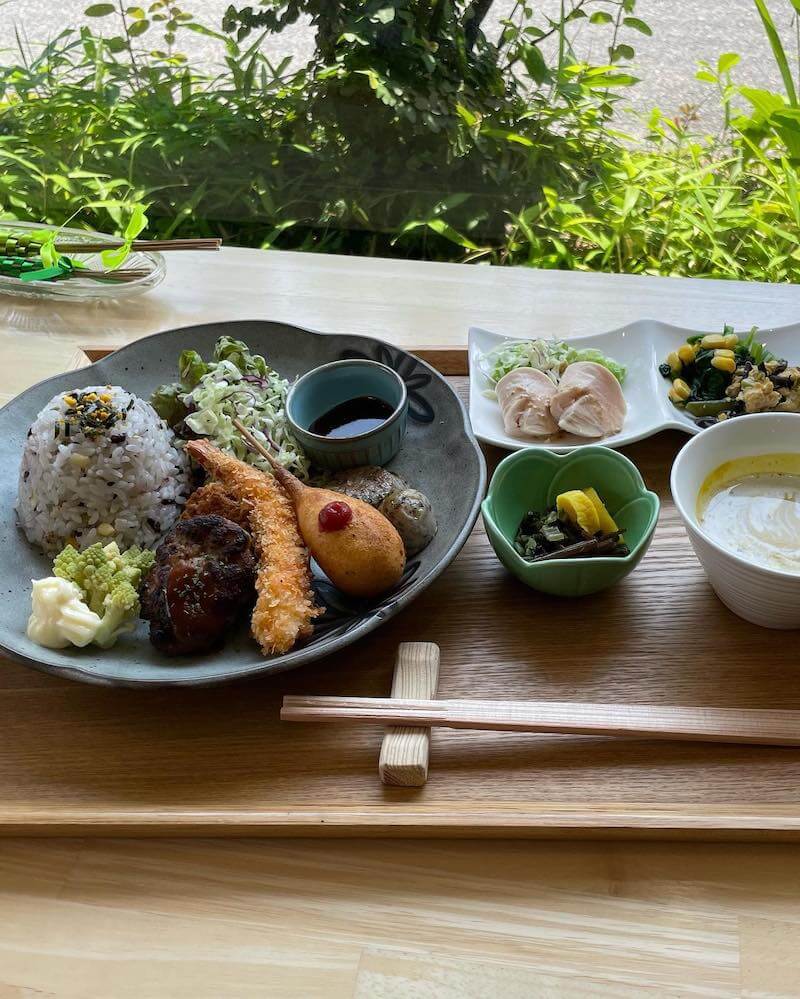 そのほかにも店内のテーブルや椅子は吉野桧、お箸は吉野杉で作られ、まさに奈良の木づくしの空間。そこには、「人々の暮らしにずっと寄り添ってきた奈良の吉野桧や吉野杉の歴史を、美味しいごはんと共に実感として伝えたい」というお店の想いが込められています。