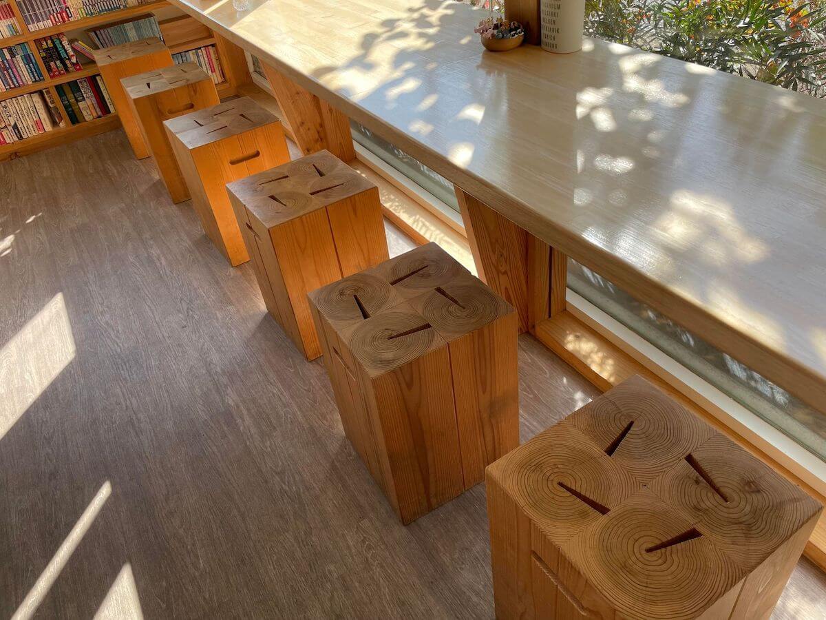 自由気ままに過ごす看板猫たちに出会えることも魅力の店内は、オーナーの木へのこだわりがそこかしこに感じられます。そして、床や天井には吉野杉を使用。テーブルなどの家具も吉野杉や吉野桧で作られているため、木の香りや温もりを空間全体で体感できます。