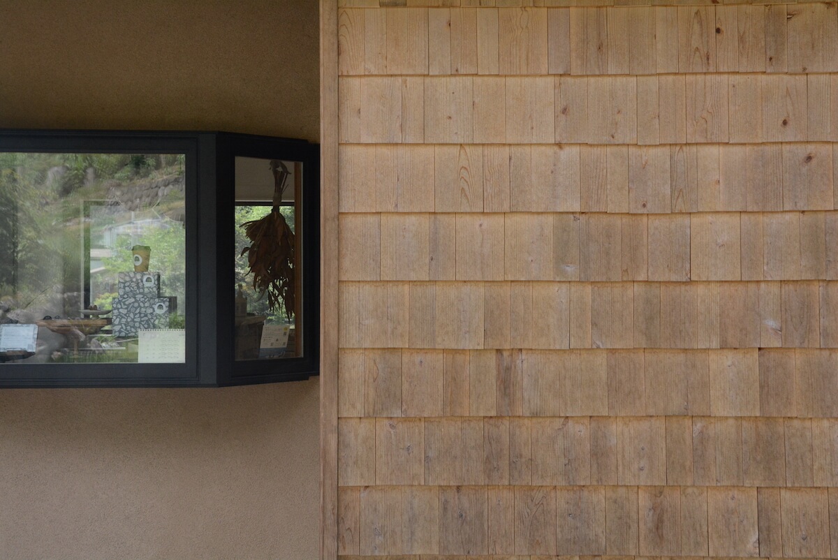 カフェの厨房になっている棟の外壁は“ウッドシングル張り”で、近くの製材所で購入した吉野杉の荒木を使ってパーツを作り、丁寧に一枚一枚張ったのだとか。それぞれ異なる木目が並ぶ外壁には、手作りすることを大切にするご夫妻ならではのこだわりが感じられます。