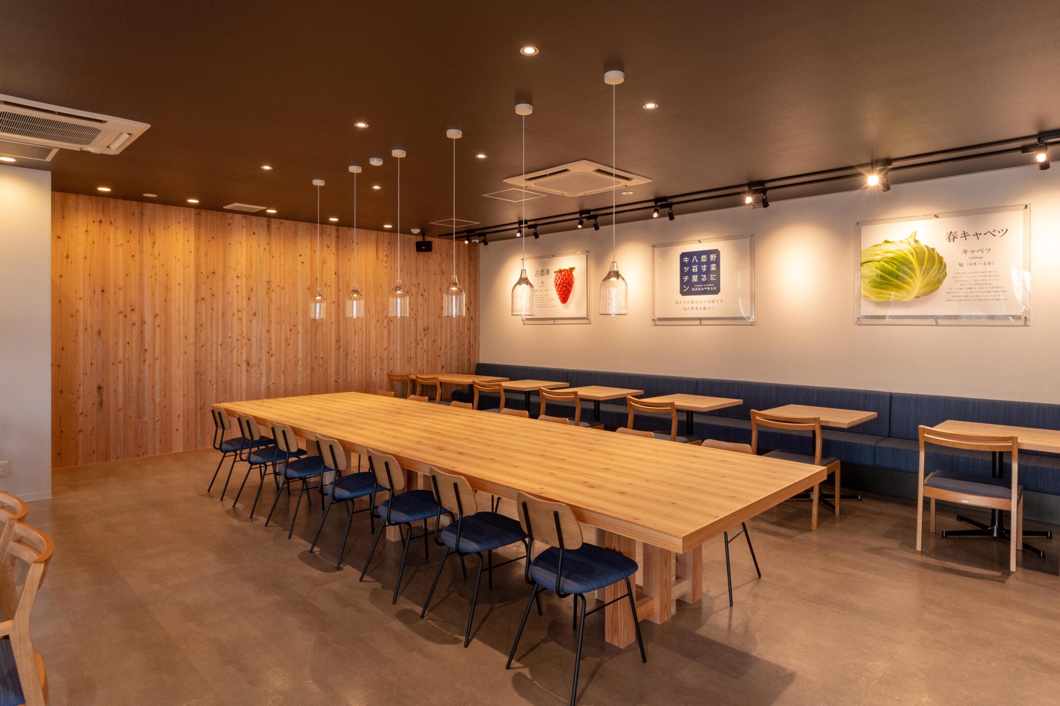 「吉野の木と共に人々が集まり、生き生きとする時間と空間を過ごしてもらうために、馴染み親しまれてきた吉野の木材を使用したい」。その想いから、建物を木造とするとともに、看板は探し求めて見つけた樹齢250年の吉野杉で作られました。