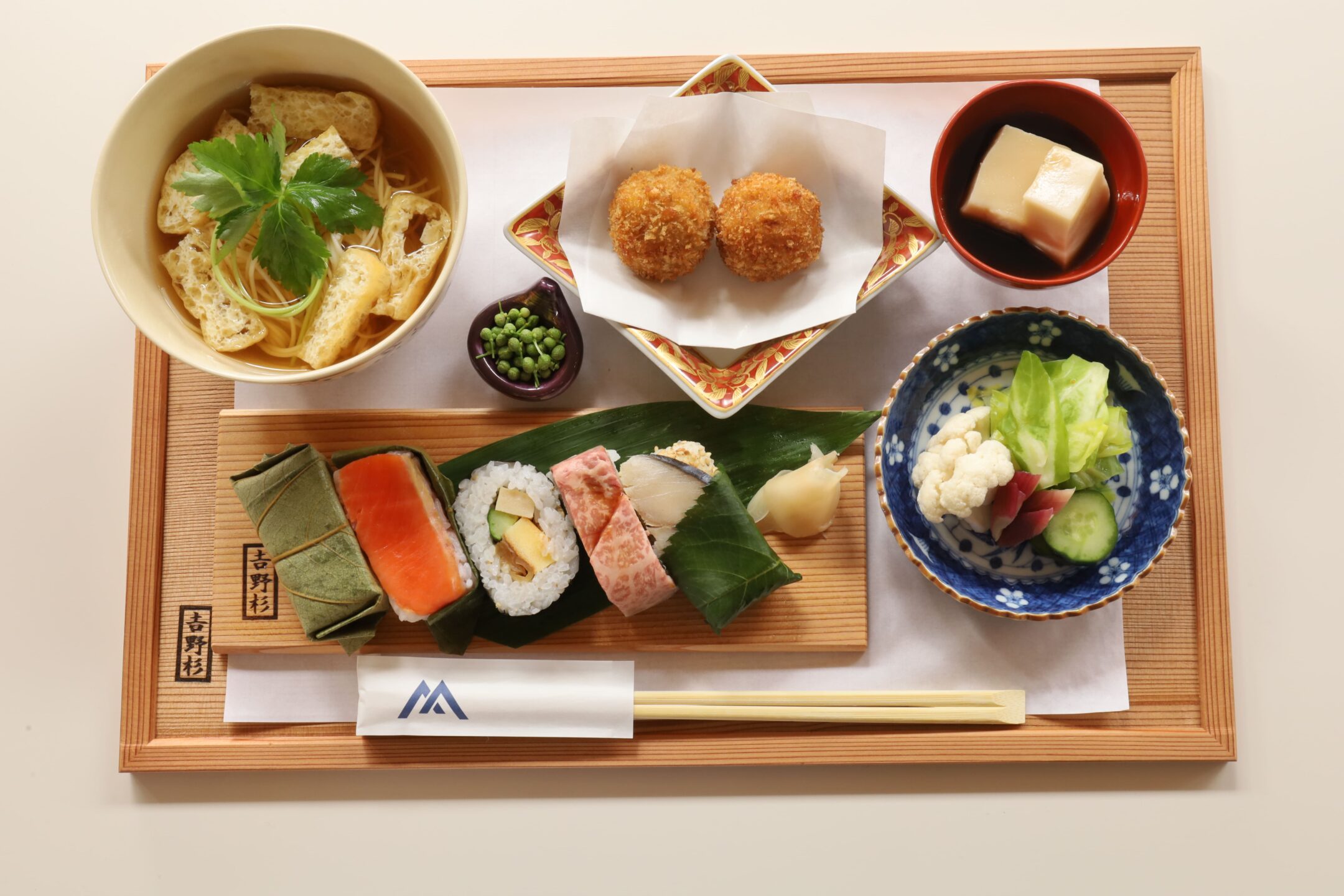 そんな木のぬくもりを感じる店内では、三輪素麺、大和牛のローストビーフの棒ずし、季節の柿の葉ずしと、奈良の食を存分に味わえます。素麺の出汁は自店で引いたもの。出汁の香りが食欲をそそります。