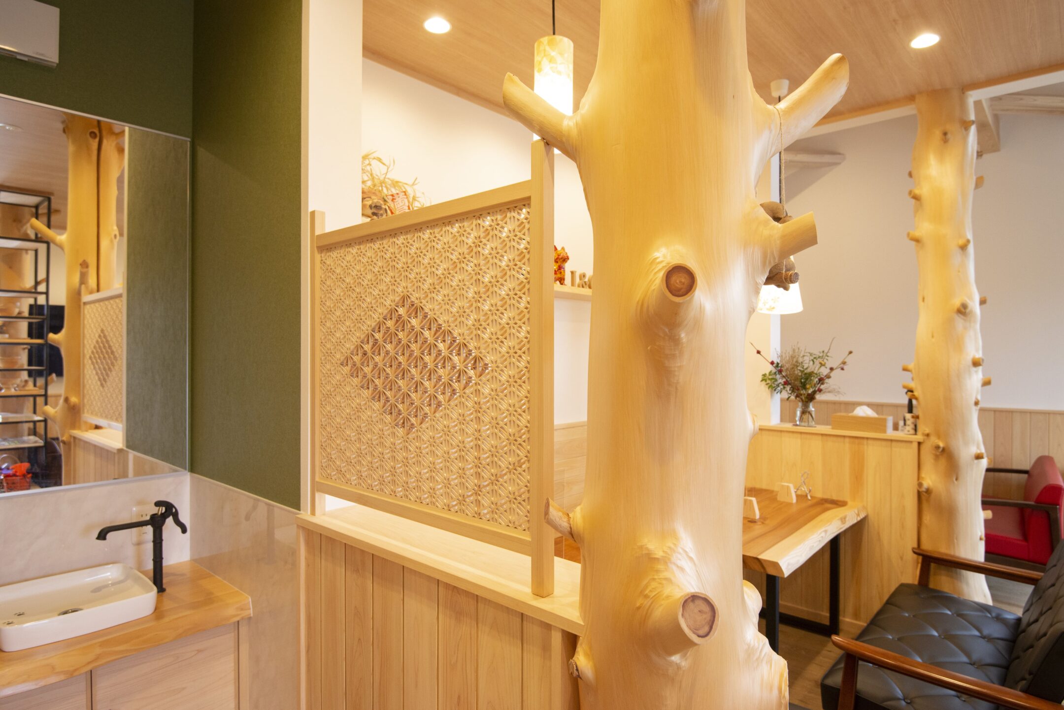 店のシンボルとなっている磨き丸太の柱は、特に店主の思い入れが強い木です。選んでいる際に、材木店の職人さんから「この柱がたくさんのお客さんに喜んでもらえるなら、こんなに嬉しいことはない」と言われ、吉野の木への愛情に感銘を受けたのだとか。