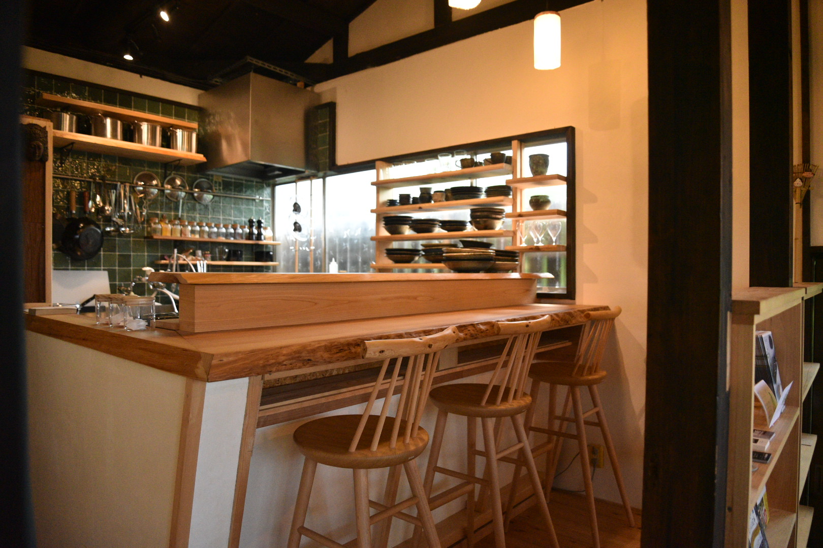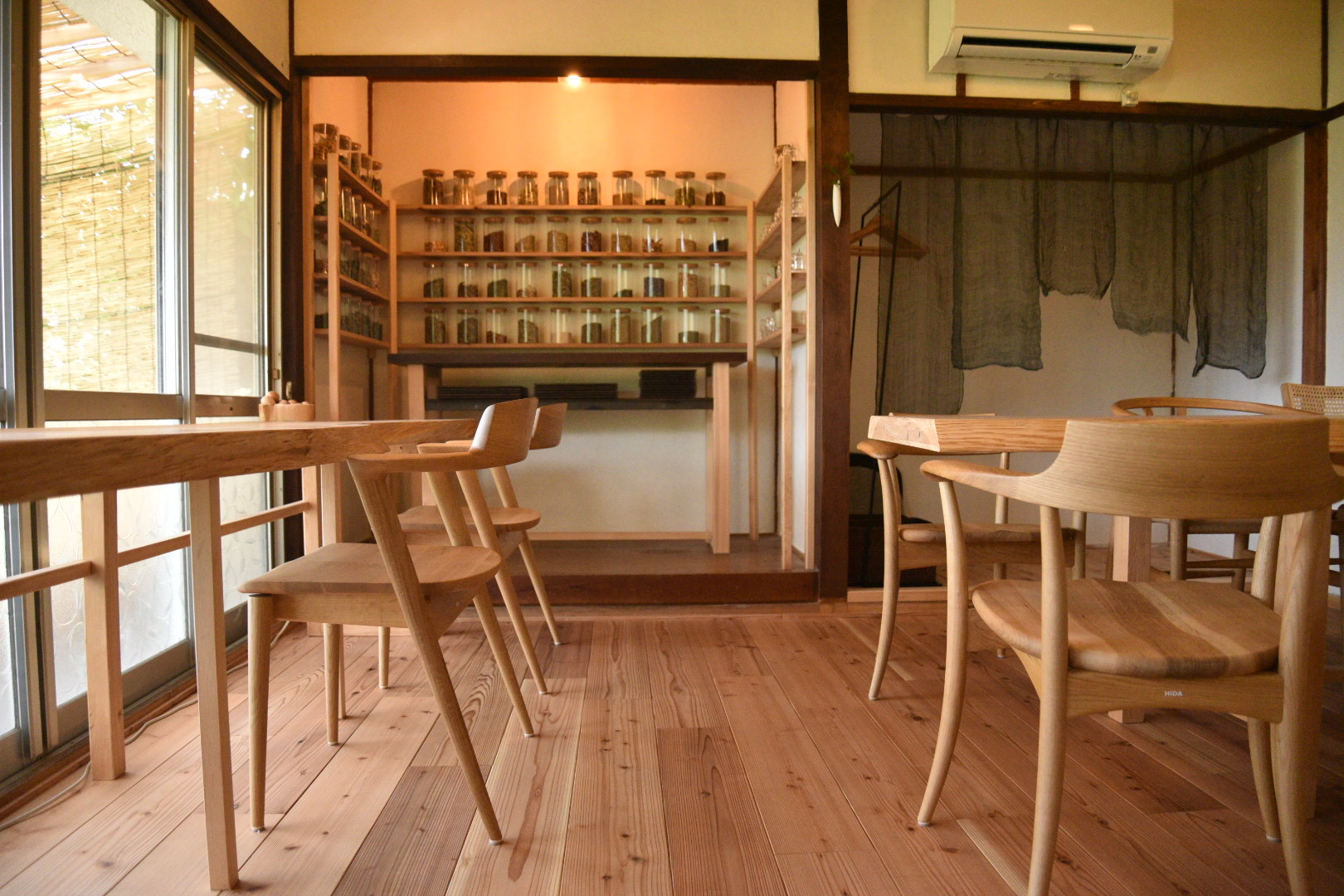 内装に使われた吉野杉や吉野桧、木の形を生かした椅子、杉皮、一枚板、フローリングの板はすべて、“ご縁”があって繋がった奥大和の林業や木材の関係者から手に入れたもの。店主夫婦がほとんど施工したという店内は、奈良の木の魅力にあふれています。また、店内では靴を脱ぐため、足裏から伝わる木の柔らかさを体感できます。