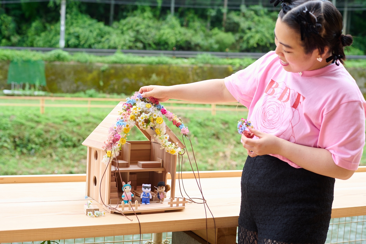 「吉野杉でできたドールハウスをお花でアレンジした唯一無二の木の家です。屋根には一輪挿しをつけて、屋根にはたくさんのお花をつけました。花の飾りは取り外してリースとしても使用可能です。」とゆりやんさん。