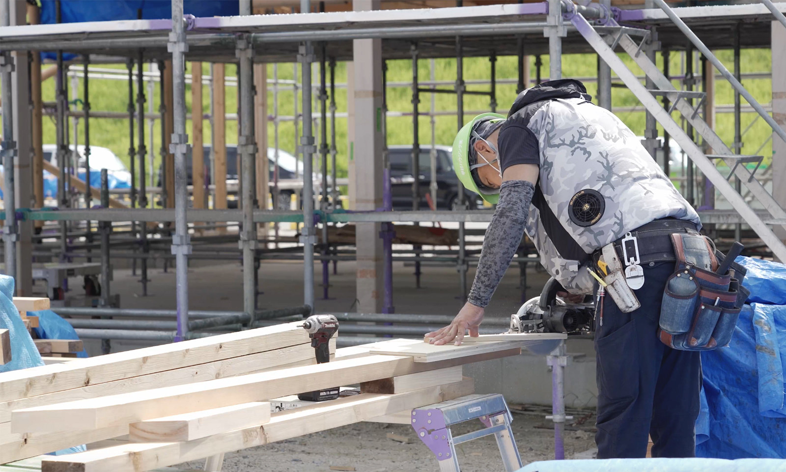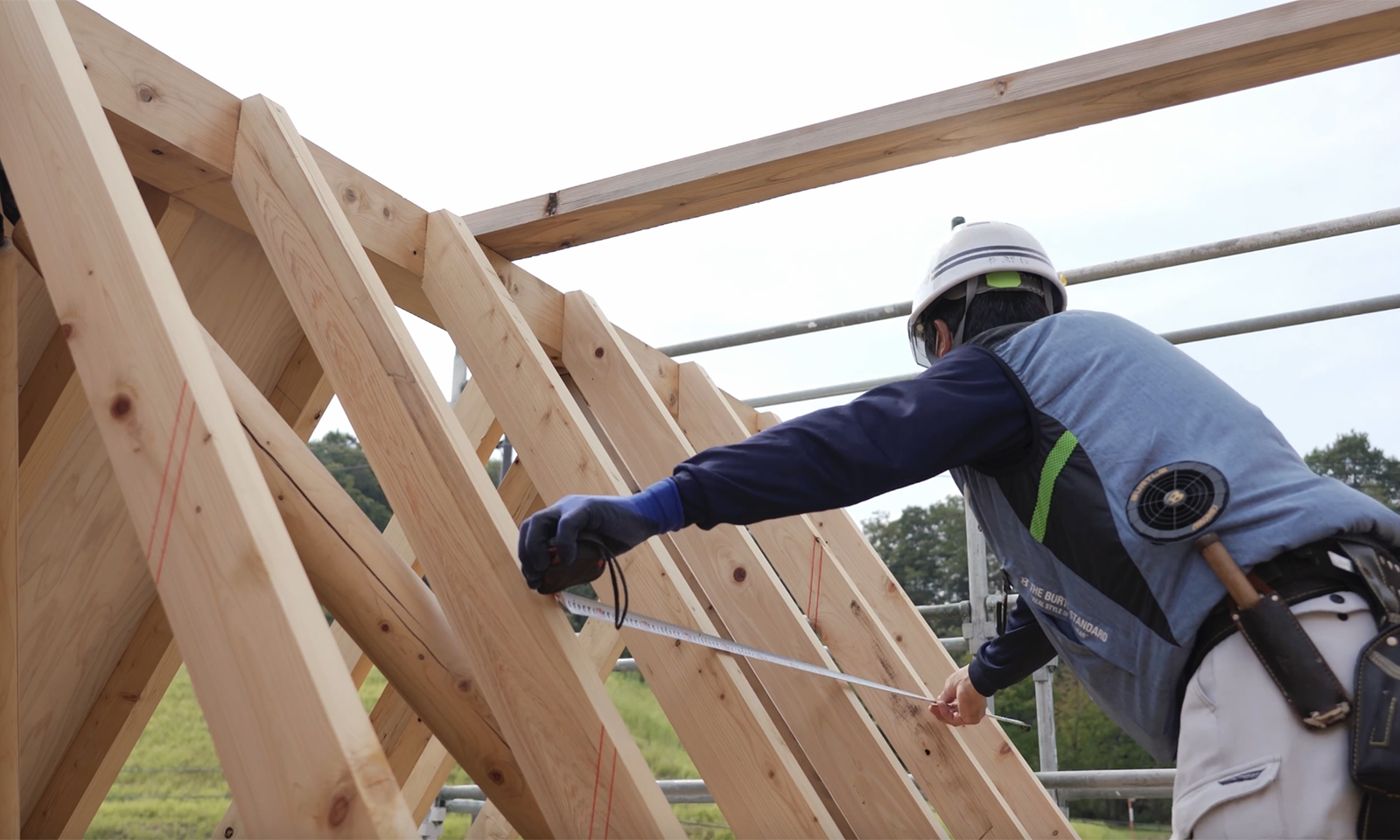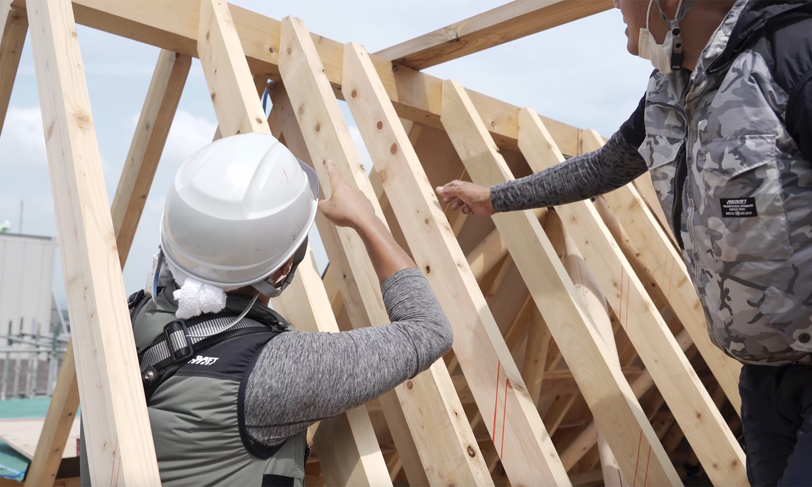 仕上がりをイメージし、工場で加工した木材を使ってどういう順番で組み立てていくと良いかを考えながら施工します。