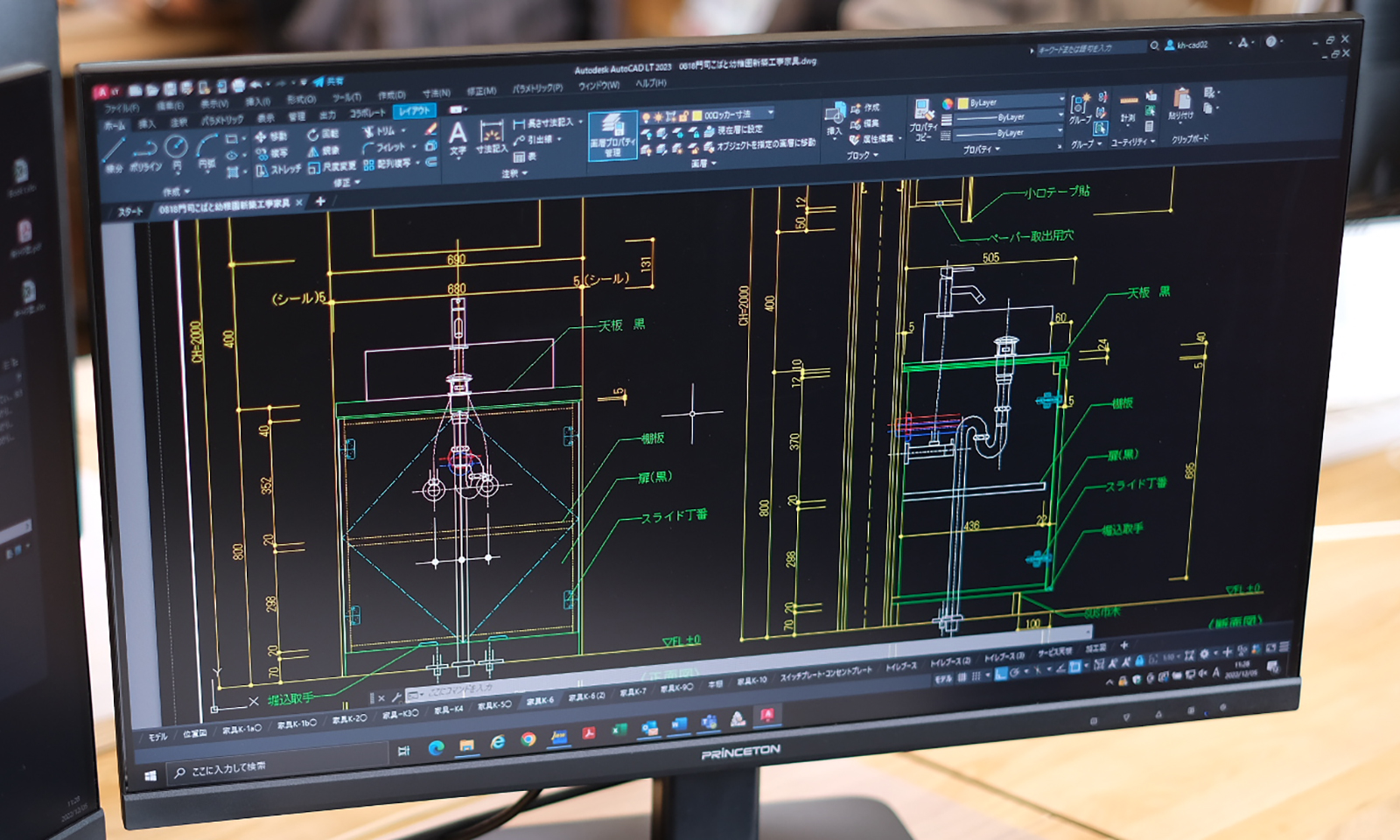 お客様からいただいた建物全体の図面をもとに、大工が施工するためのより詳細な図面をCAD(キャド)というソフトウエアで作成します。