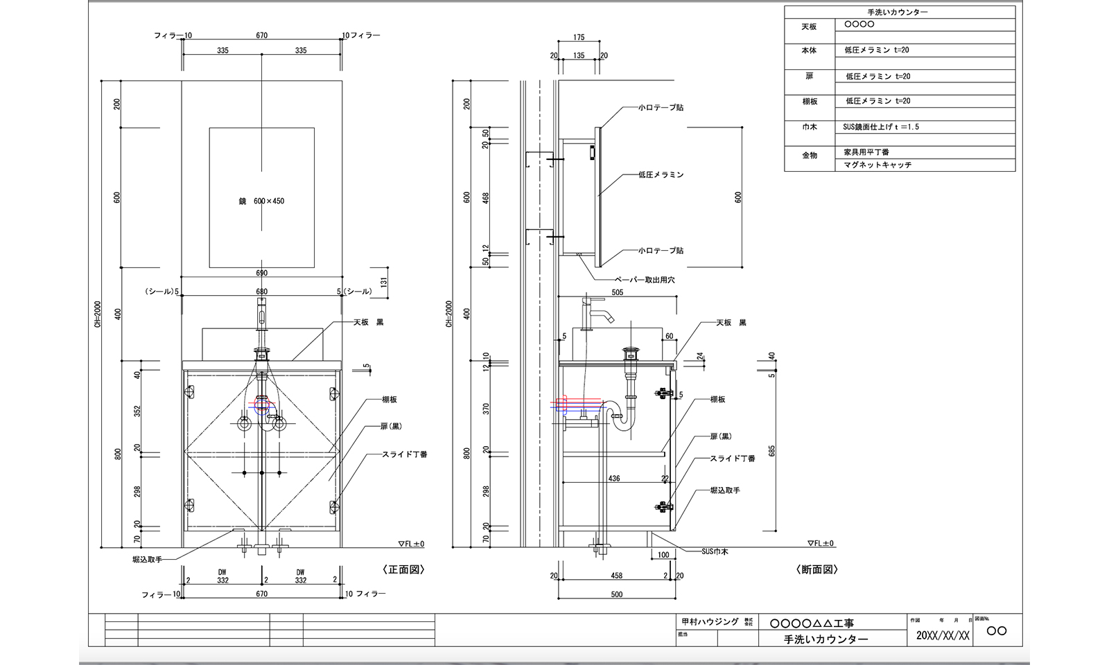 設計士が描いた設計図は「建てたい建物」のイメージです。CAD(キャド)オペレーターは建物に使われる木の部分を具現化することが仕事です。誰でも図面どおりに施工すれば組み立てられるよう、平面図、展開図、断面図、詳細の拡大図面など細かく作成します。例えば、洗面台のカウンターの図面を作る場合は、メーカーの図面に合わせて、洗面台が収まるよう寸法・品番等を図面に描いていきます。また、天井の図面の場合には、板を貼る順番も記さなければなりません。