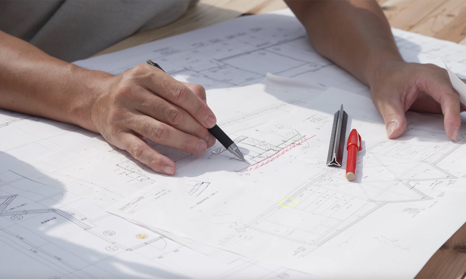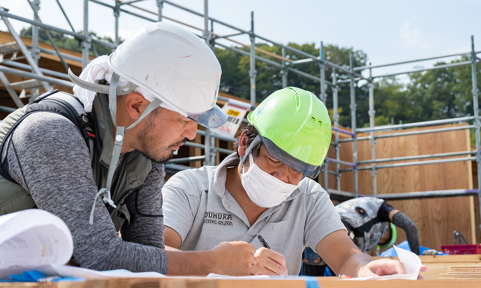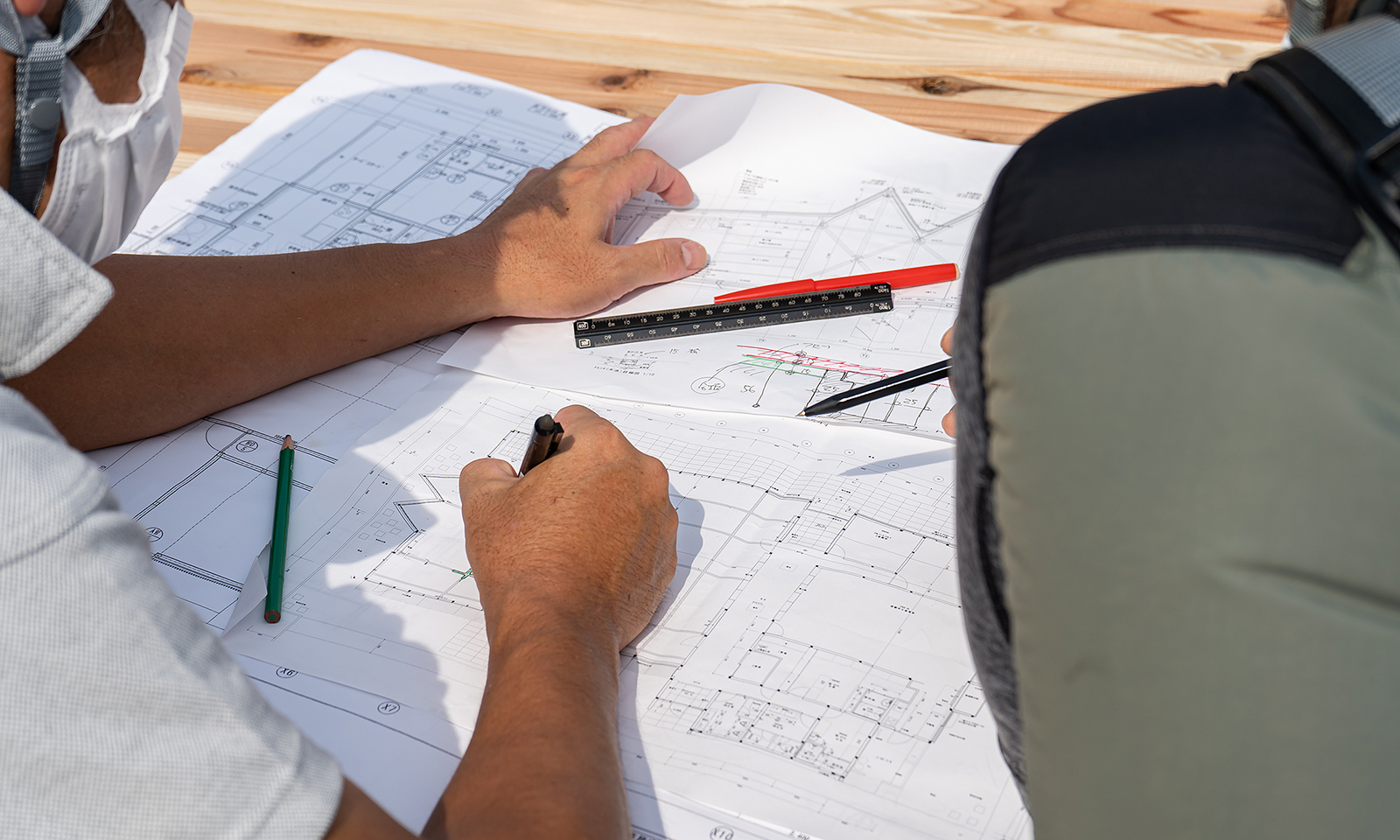 CAD(キャド)で作成した図面は、現場の造作大工(ぞうさくだいく)に確認してもらいながら、さらに図面を仕上げていきます。過去の施工事例や多くの職方(しょくかた)の意見を設計士に伝え、「建てたい建物」と実際の施工が擦り合うまで何度もやりとりを重ねます。また、工事が進むにつれて現場が変わってくることもあるため、描いている図面との違いをその都度確認し、修正していくことも必要です。
