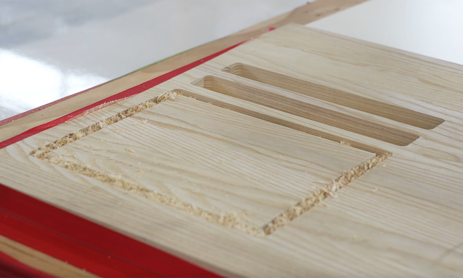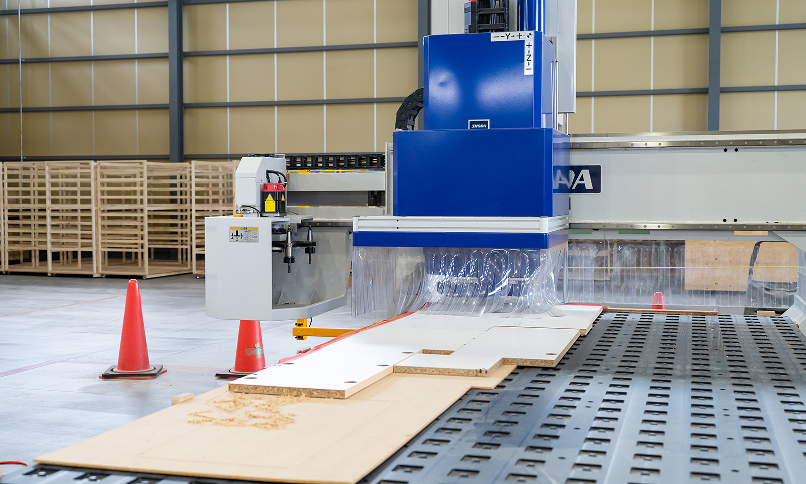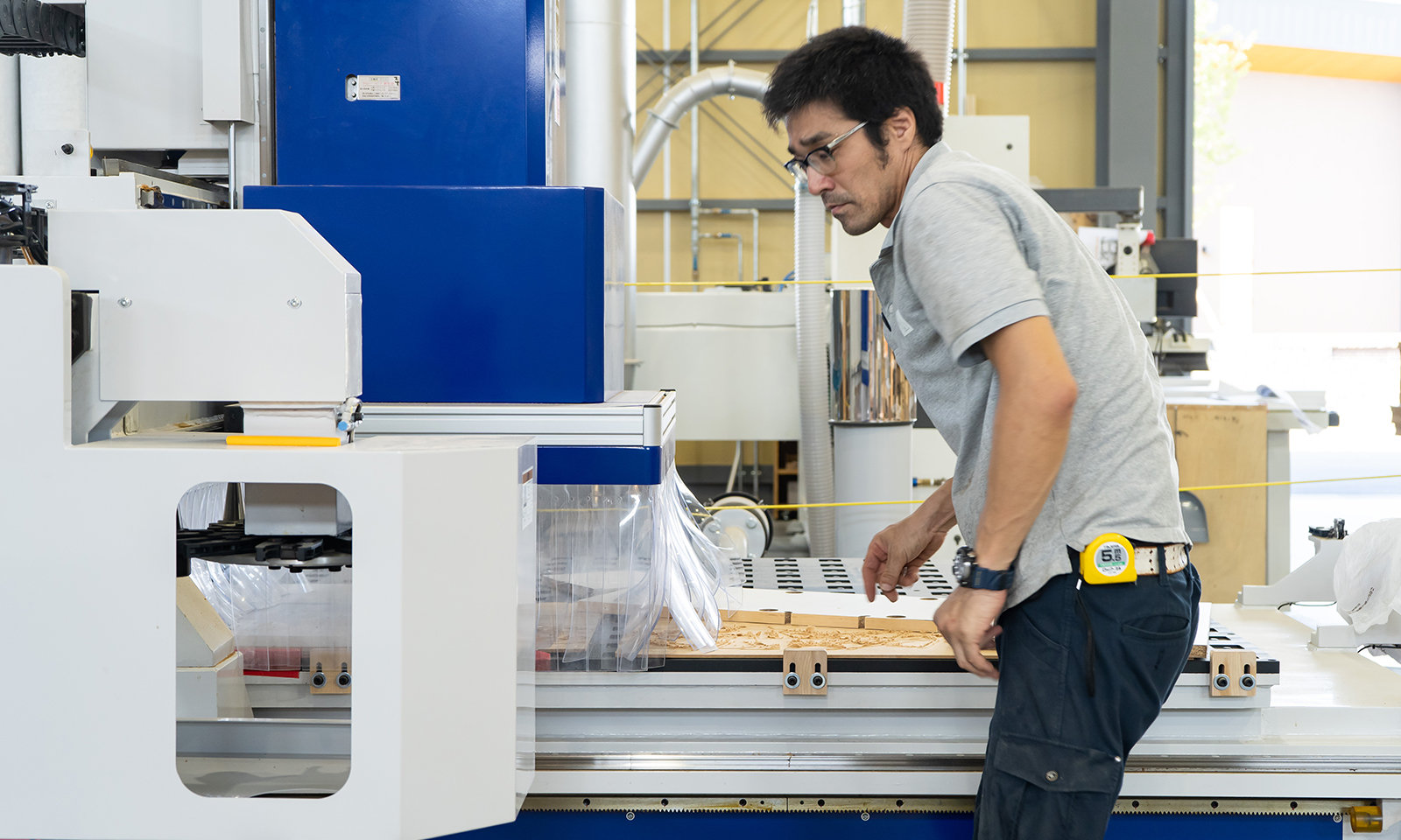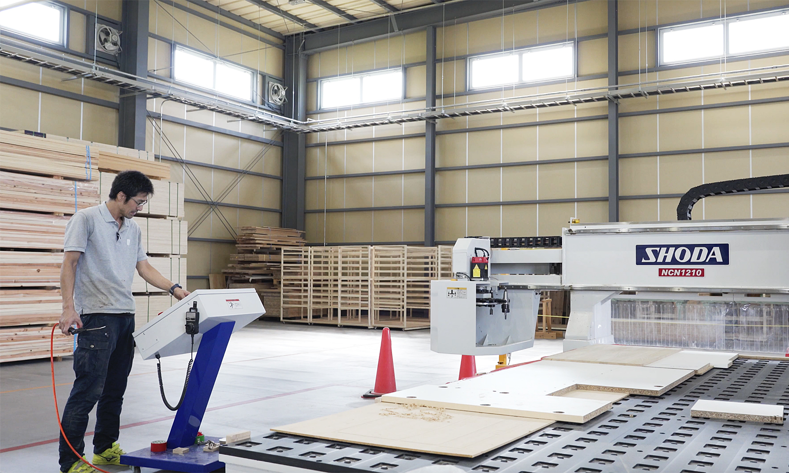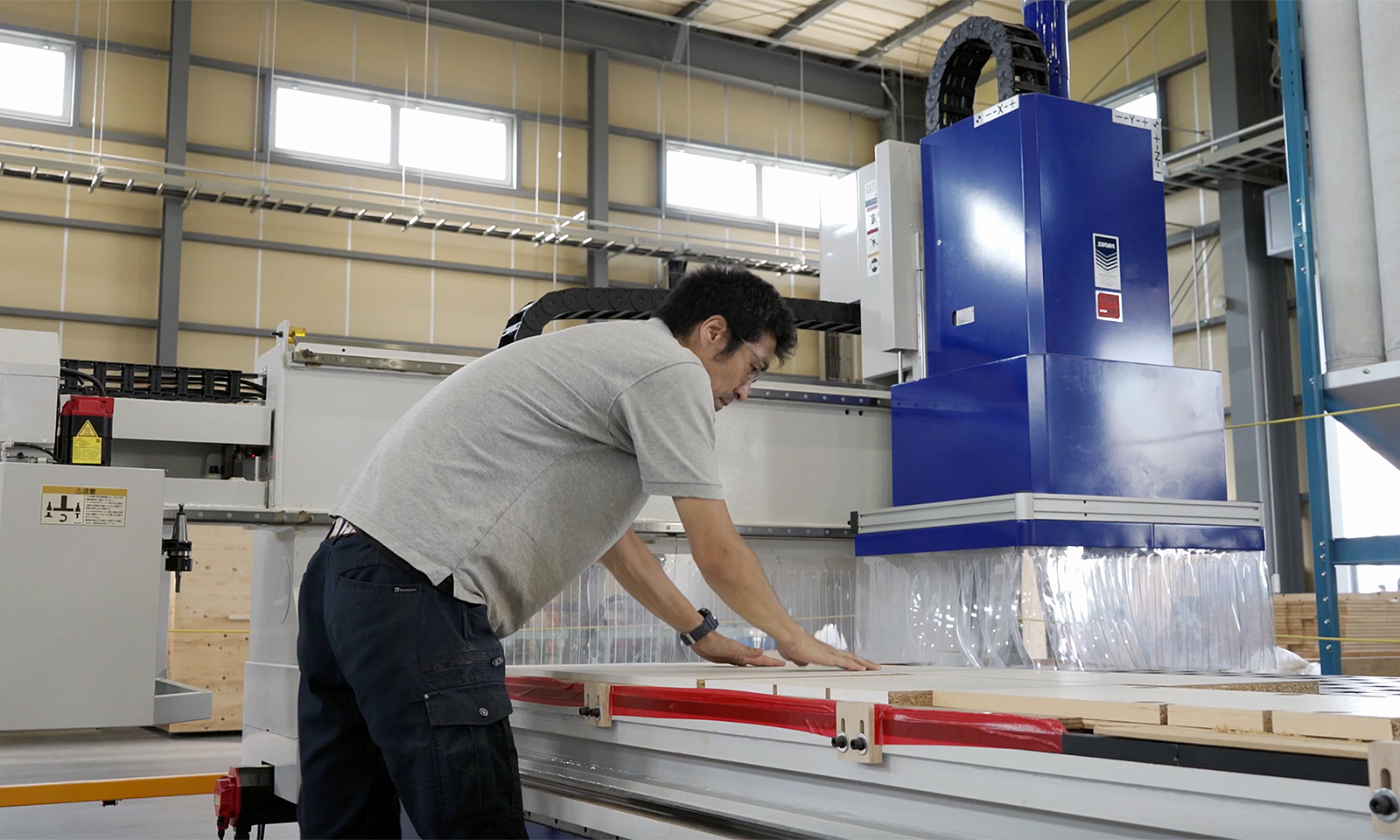 次に、CAD(キャド)オペレーターと連携しながら、工場で木材加工をします。今までは職人が手作業でしていた穴あけなどの細かな加工も、CAD(キャド)で作成した図面データを読み込ませることで機械でできるようになりました。