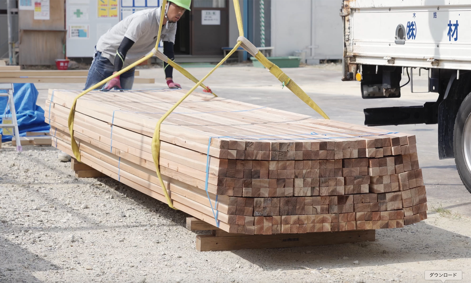 工事現場で使う部材を工場で加工し、組み立てる部分ごとにまとめます。現場で木材を加工すると、木くずが出て掃除が必要になるなど仕事が増えますが、工場で加工することによって、品質を一定に保つことができ、現場での作業がスムーズになります。また、材料の選別も工場で行うため、悪い材料をあらかじめ避けることも可能です。