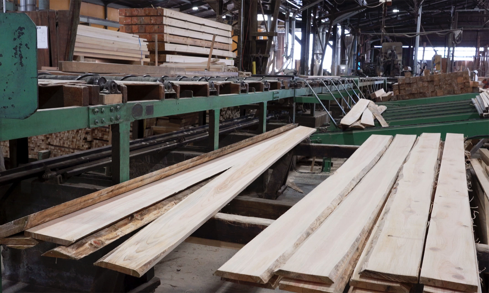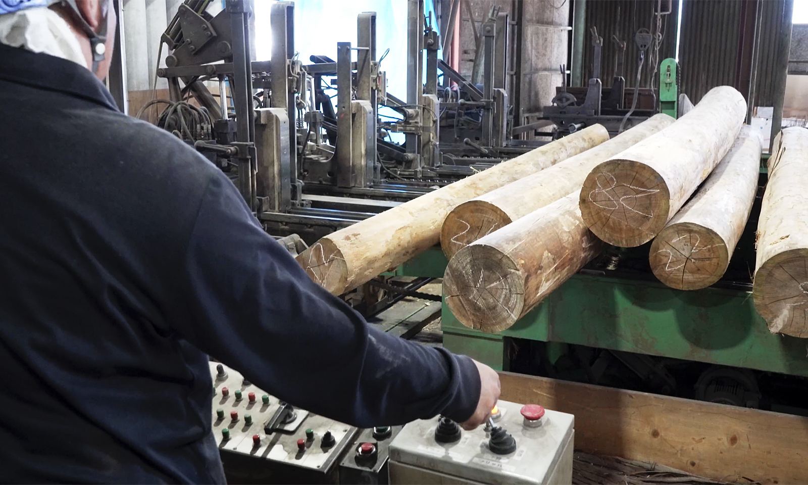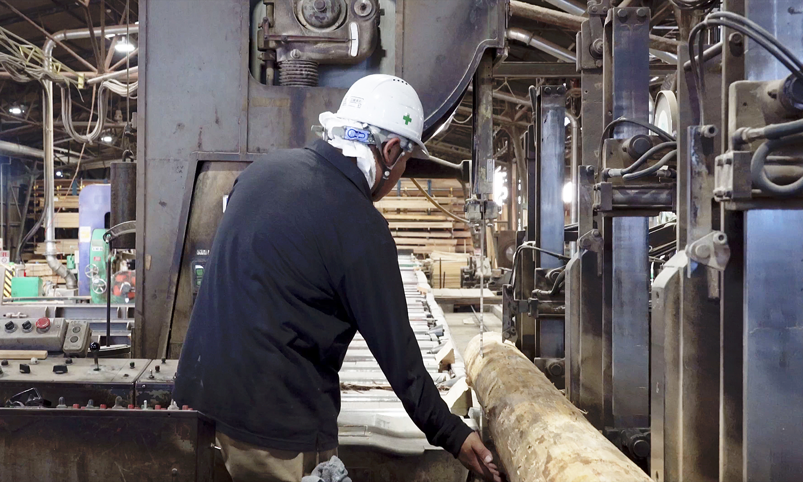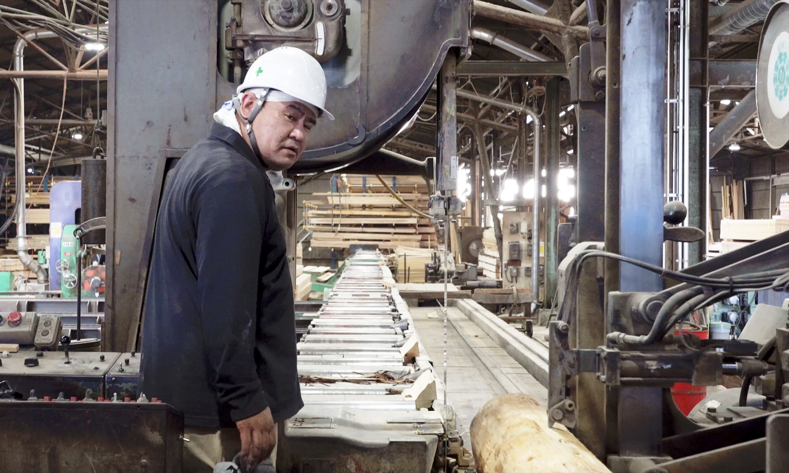 わたしたちは山から伐(き)られてきた丸太・木材、そういったものを工場で製材して世の中に出すことで、建築業界の方々であったり、家具業界であったり、いろんな業種の方々に木材を届ける一番最初のスタートが、わたしたちの担いだと思っております。