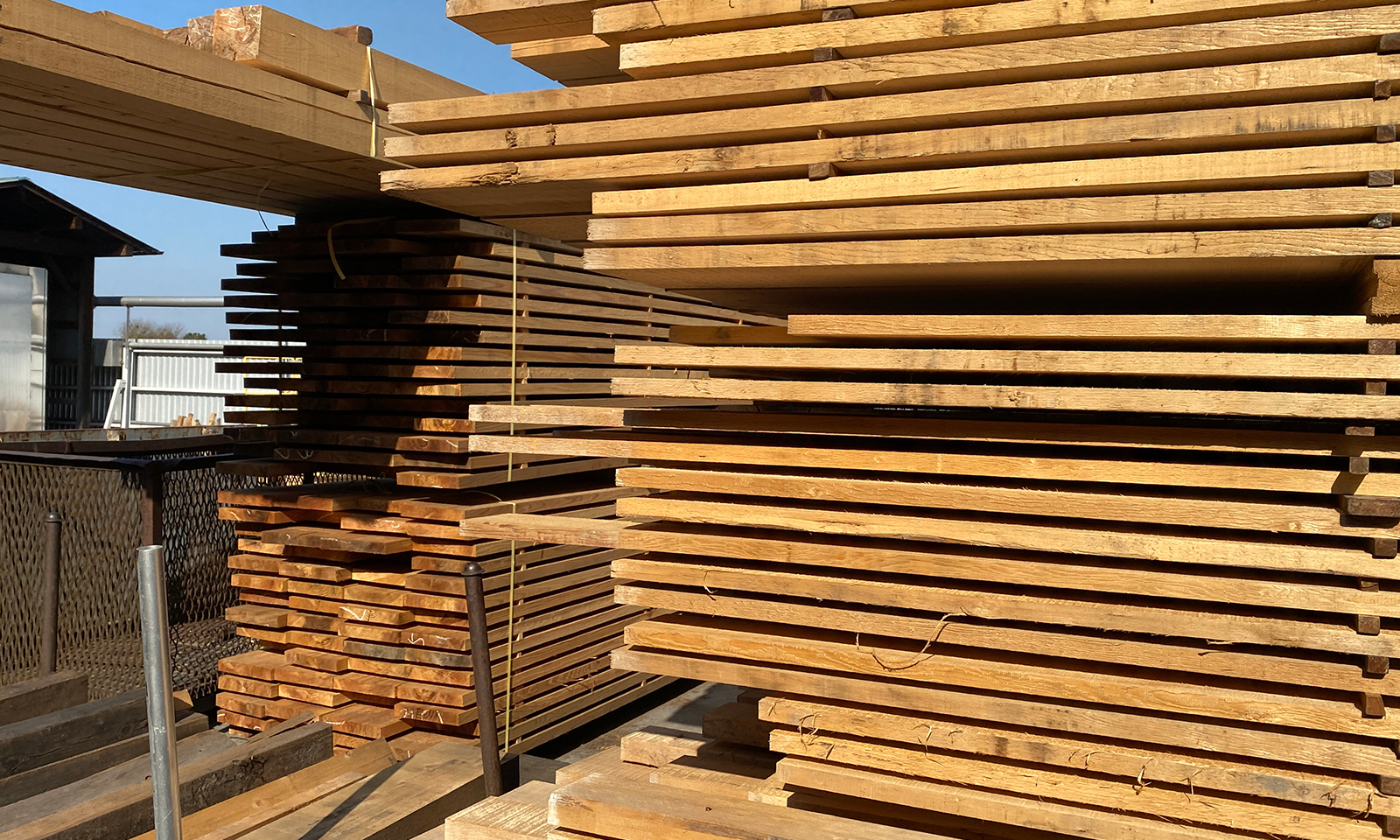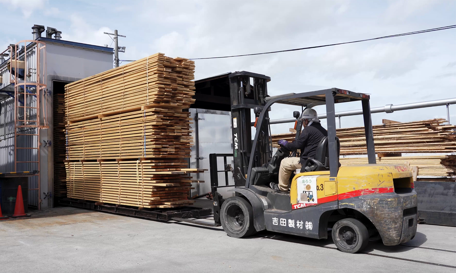 乾燥には、自然乾燥と機械を使う人工乾燥があります。自然乾燥は、風・太陽熱などの自然エネルギーを利用しますが、乾くのに少なくとも1カ月、ものによっては1年かかります。人工乾燥は、1週間から10日ですむことが多いため、少しでも早くお客様に届けることができます。