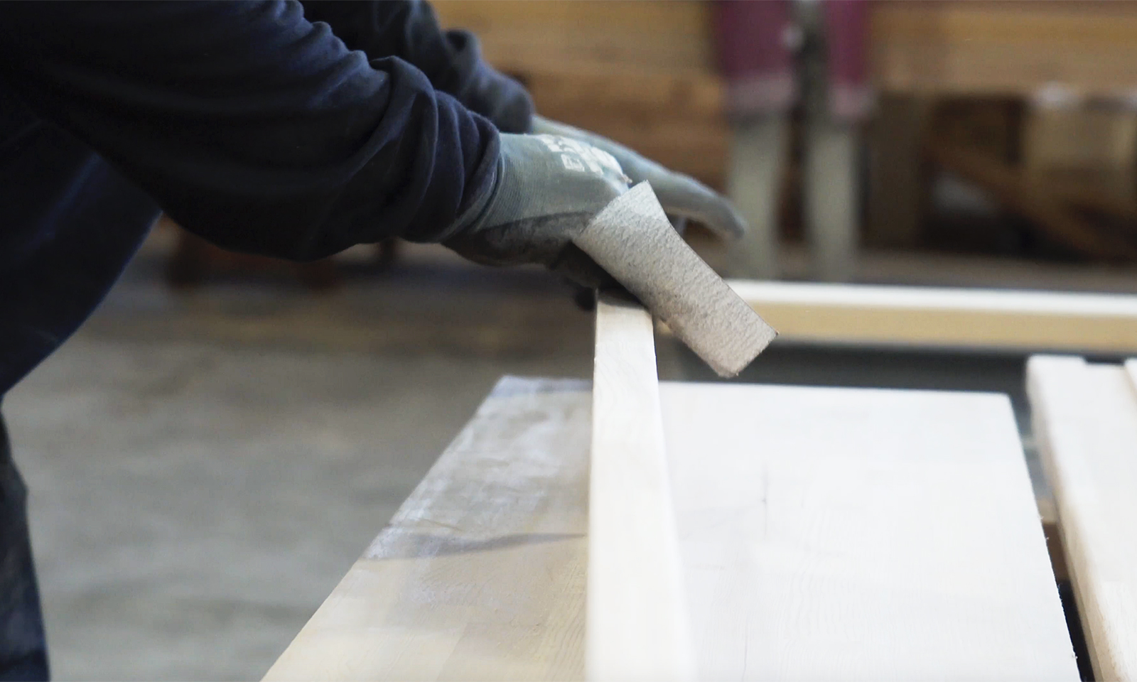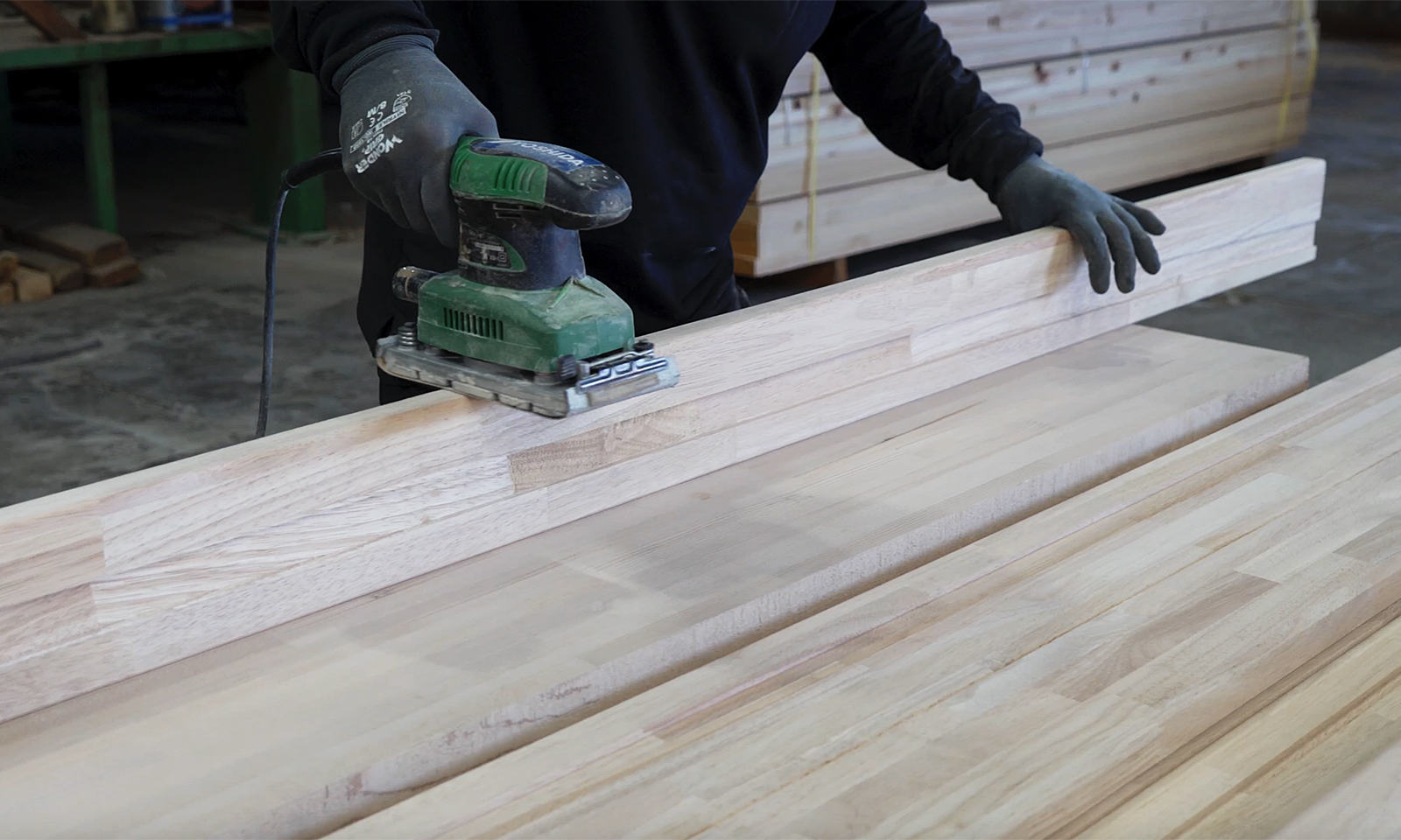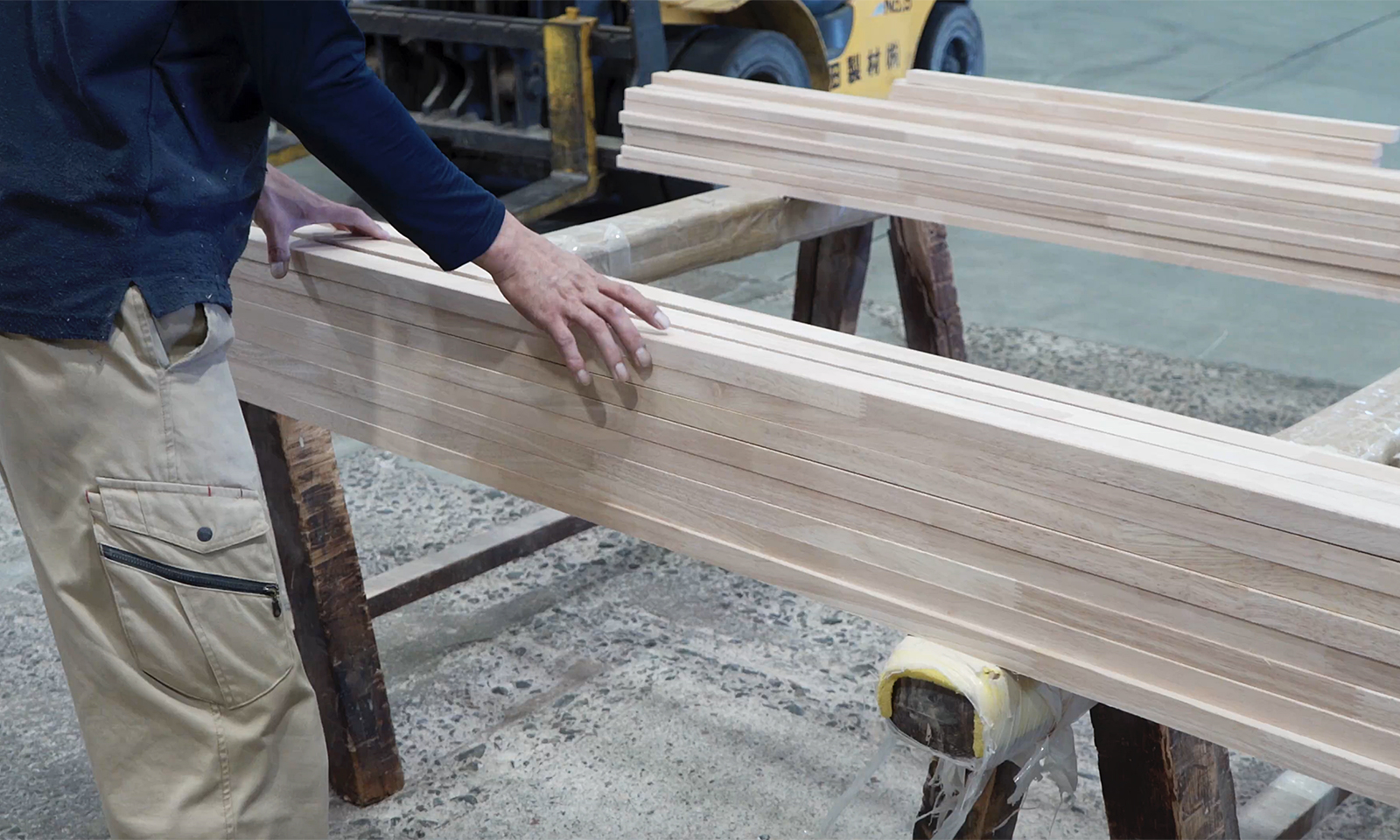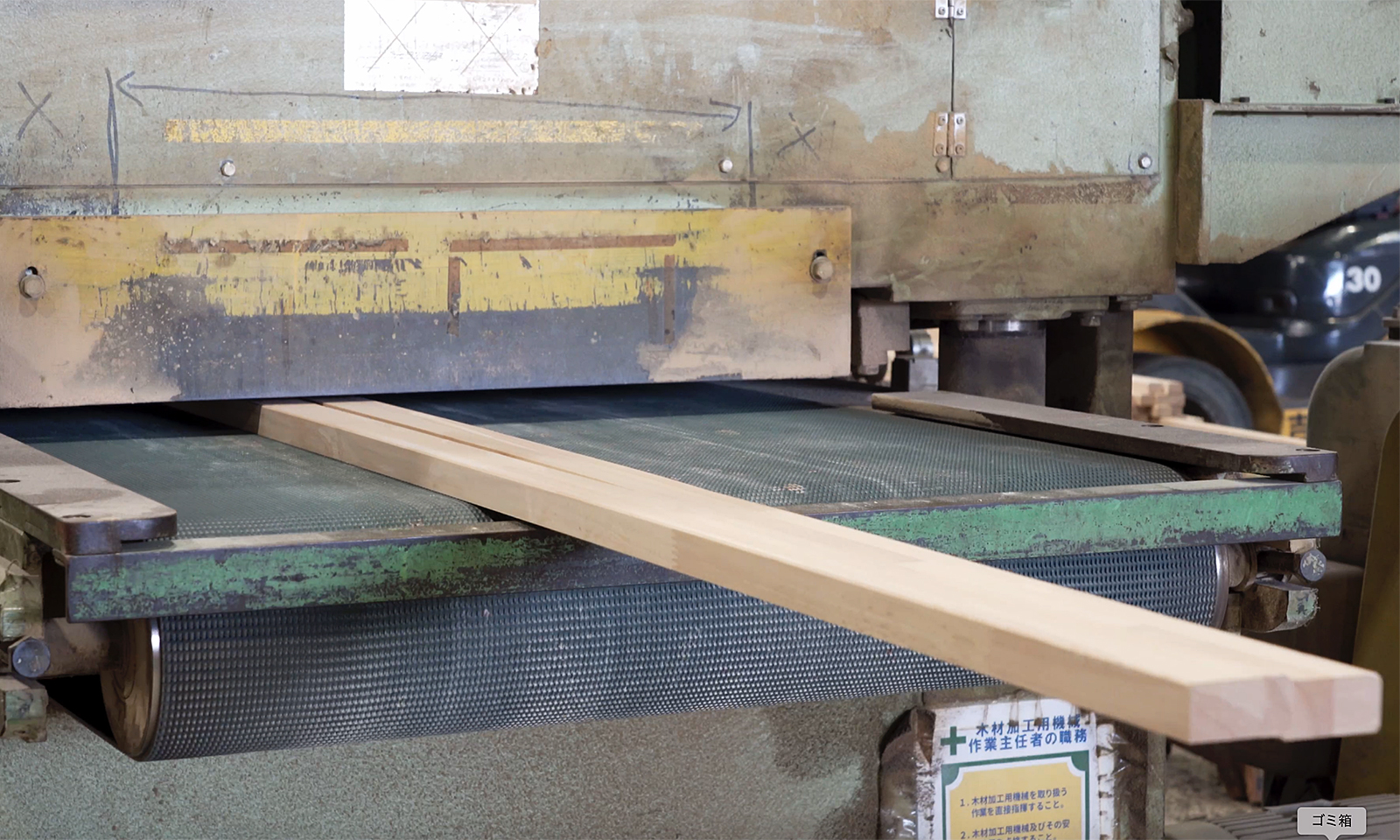 製材機でカットし乾燥させた木材は、表面がざらりとした状態の荒材(あらざい)です。荒材(あらざい)の状態では見た目・手触りが悪いため、表面に仕上げを施します。カンナで表面を整える「プレナー仕上げ」から、サンドペーパーできめ細やかに仕上げる「サンダー仕上げ」、さらに細かく仕上げる「超カンナ仕上げ」があり、用途によって使い分けます。
