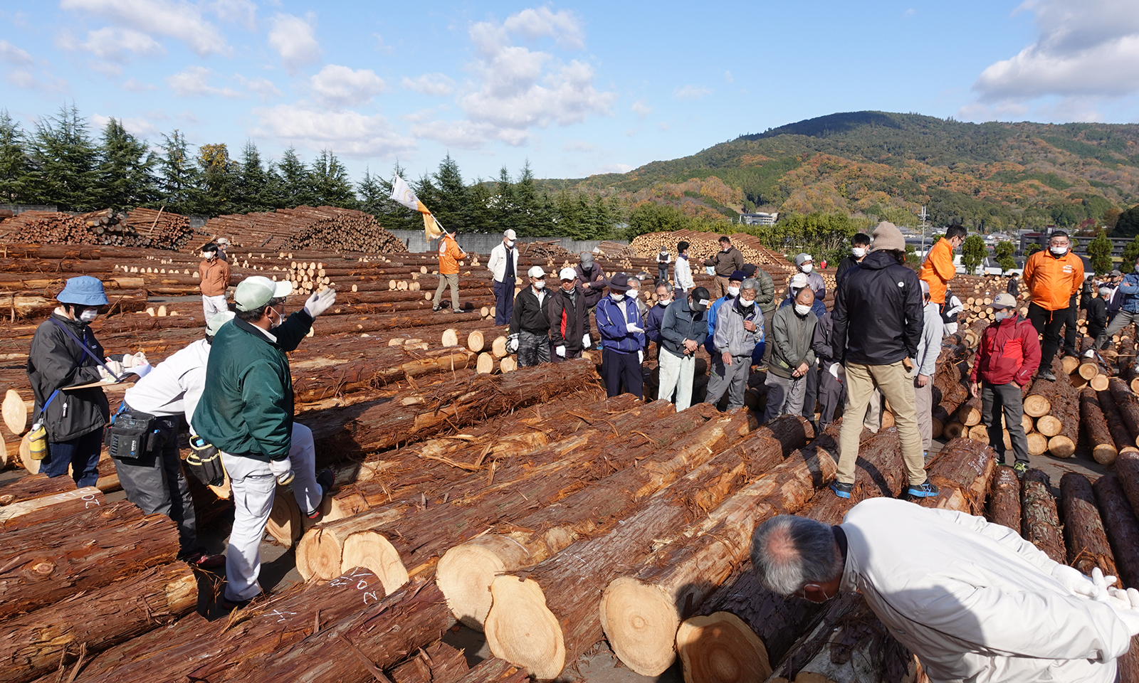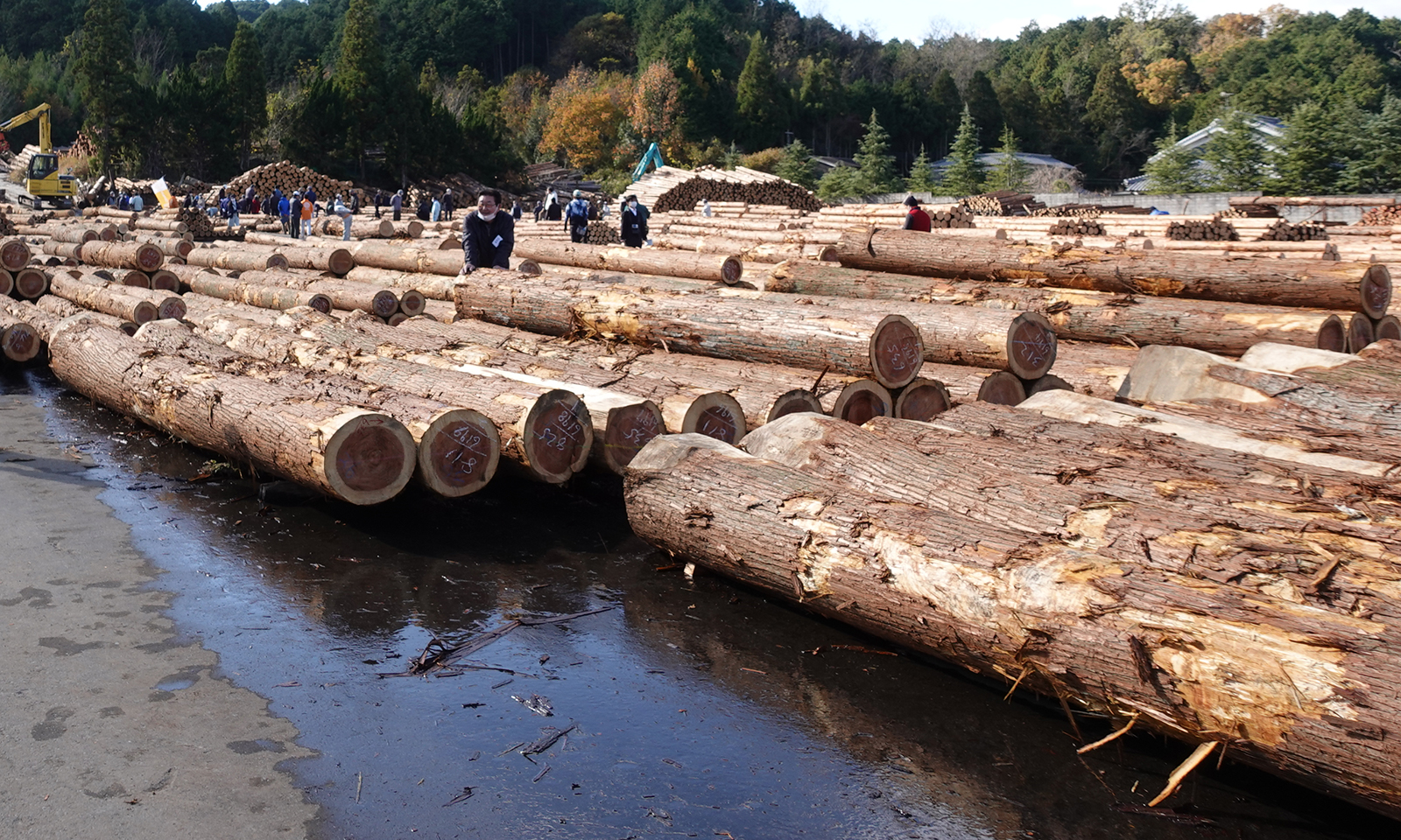 まず、山から伐(き)り出された丸太を競(せ)りにかけ販売する原木市場(げんぼくいちば)などで丸太を購入します。奈良県内には桜井市や吉野町などに原木市場(げんぼくいちば)があります。