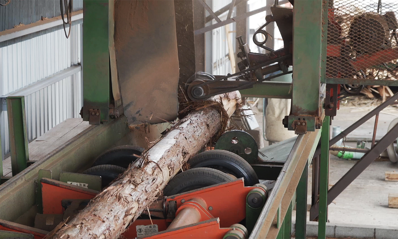 仕入れた丸太を機械に乗せて、1本1本皮をむいていきます。