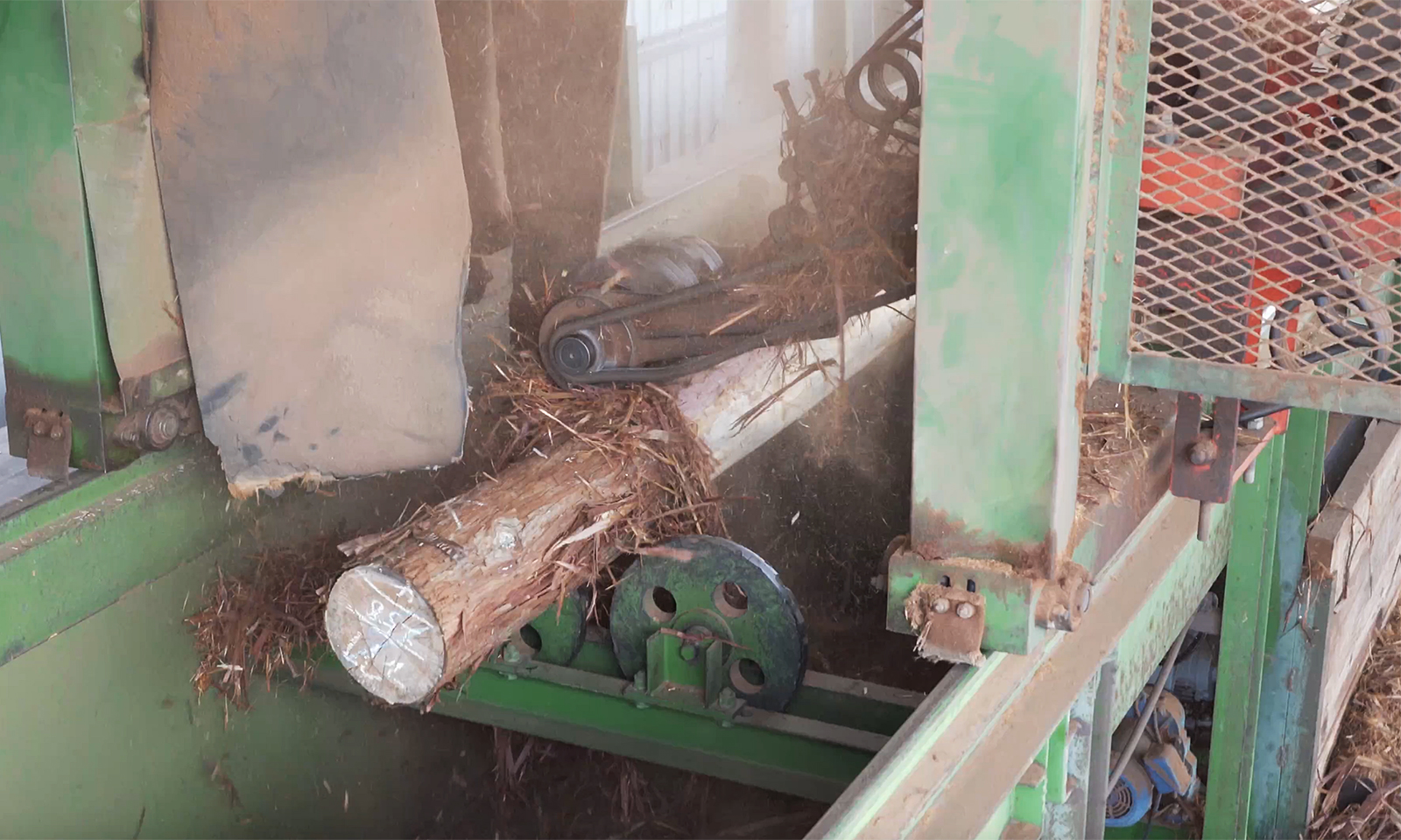 機械には四角いギザギザの刃が何本もついており、爪でひっかくように皮をむいていきます。刃先は丸くなっているため、木を傷つけることなく、皮だけむける仕組みになっています。