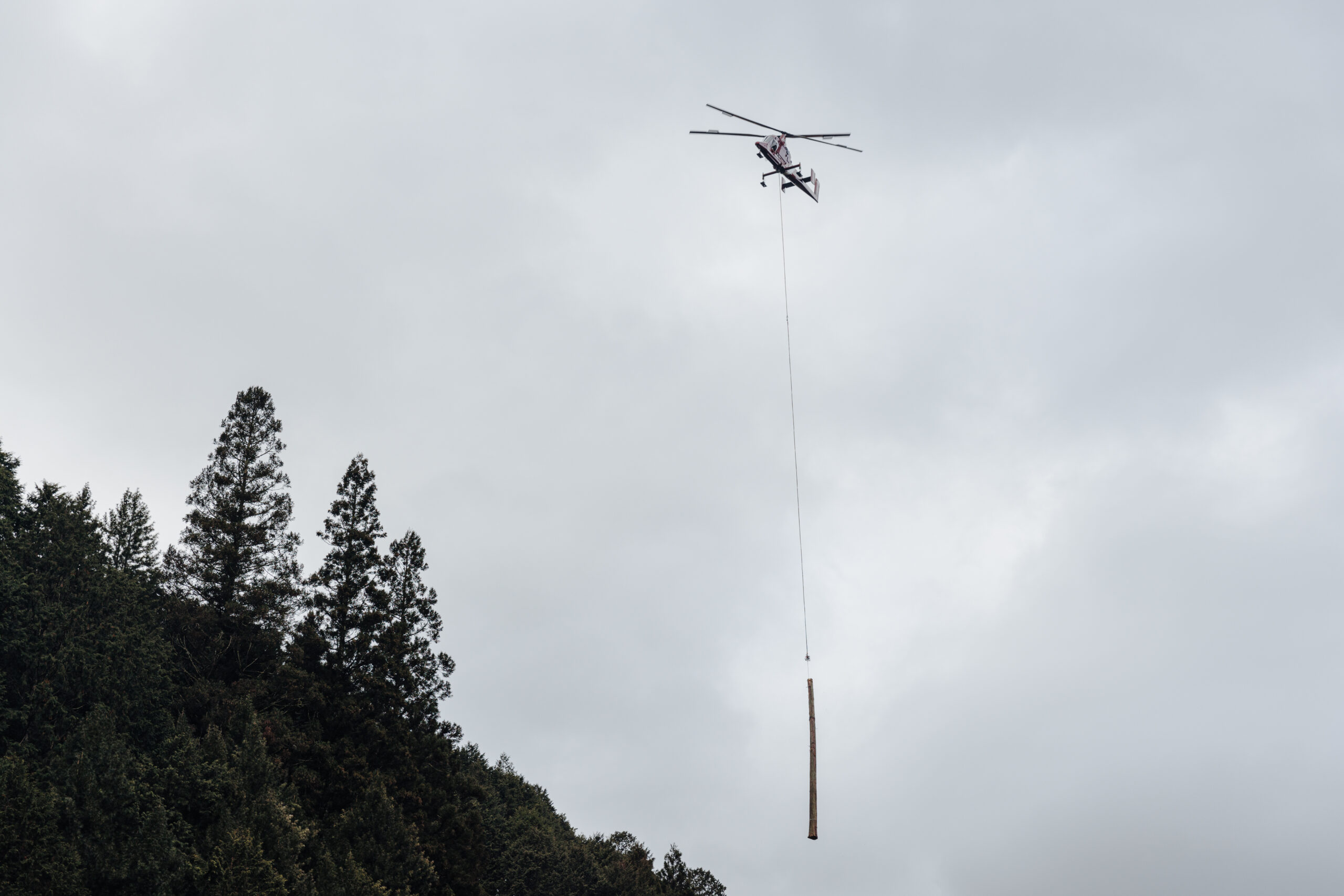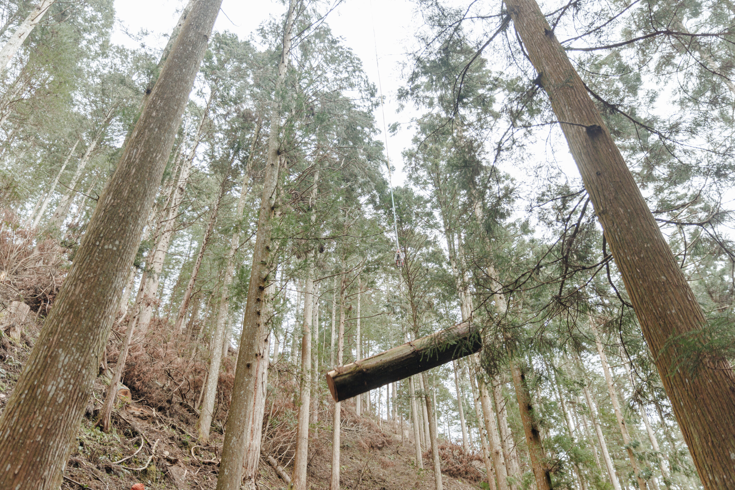 山の中に横たわる樹齢何百年という木を相手に、職人たちが手際良く作業を進めていく。1分1秒も無駄にしないという気迫と、無駄のない動き。次々にワイヤーが張られ、操縦者に合図が送られると、そこに体をゆらすような振動でヘリコプターが近づいてくる。ワイヤーがヘリコプターにつながると、人の何倍もの大きさの木の幹が宙に揺れた。そのまま垂直に木々の間をぬって、吉野杉の大木は上空へと運ばれていく。