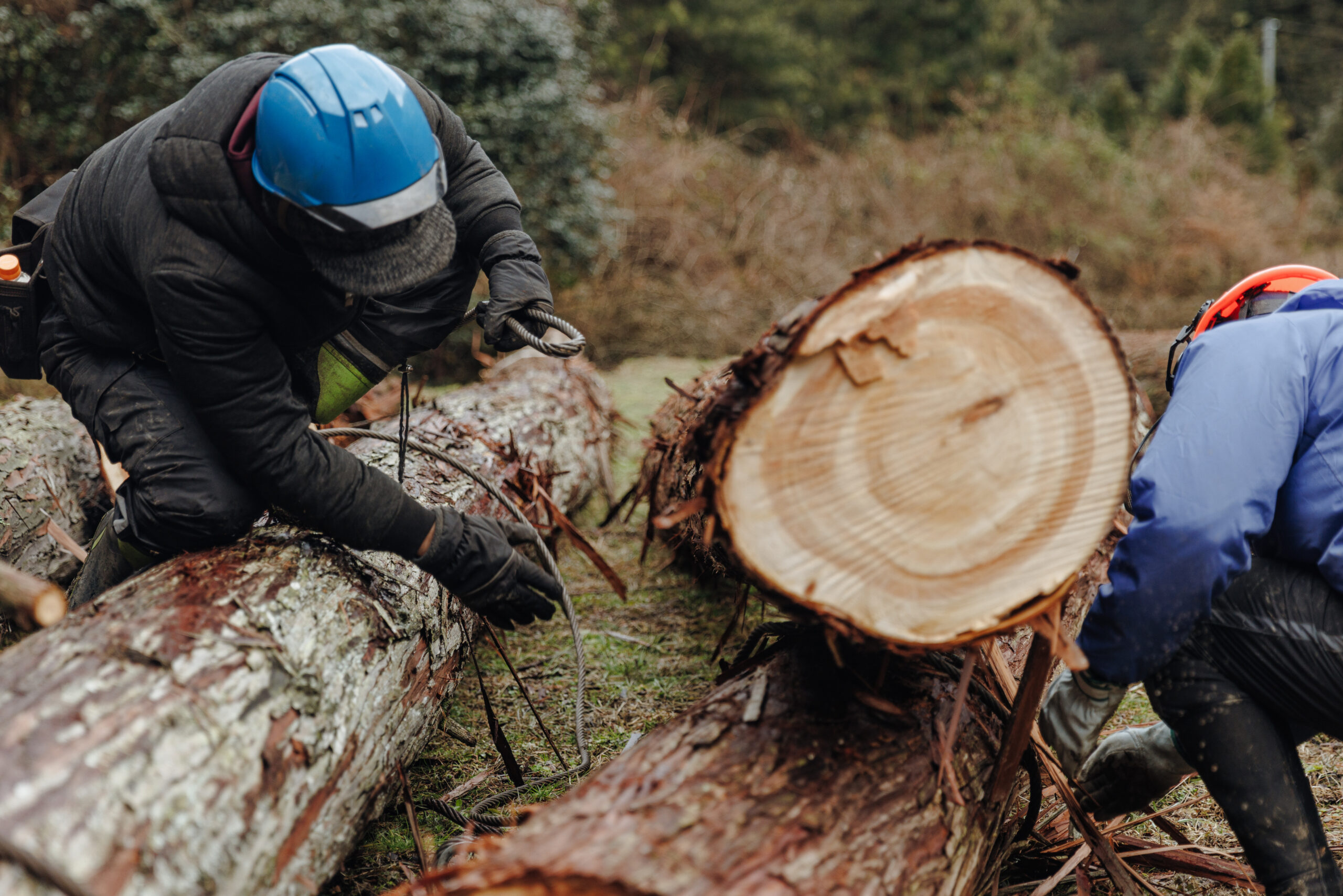 木を伐るにも、それぞれが役割分担で協力して作業にあたります。木を伐る人がいたり、ロープを引っ張る人がいたり。自然の中なので、体力的にもきつい、過酷な環境で作業をすることも多いですが、自分もきついけど、周りもきついと思うようにしています。自分だけだと思わないようにすることが大切だと常に意識しています。