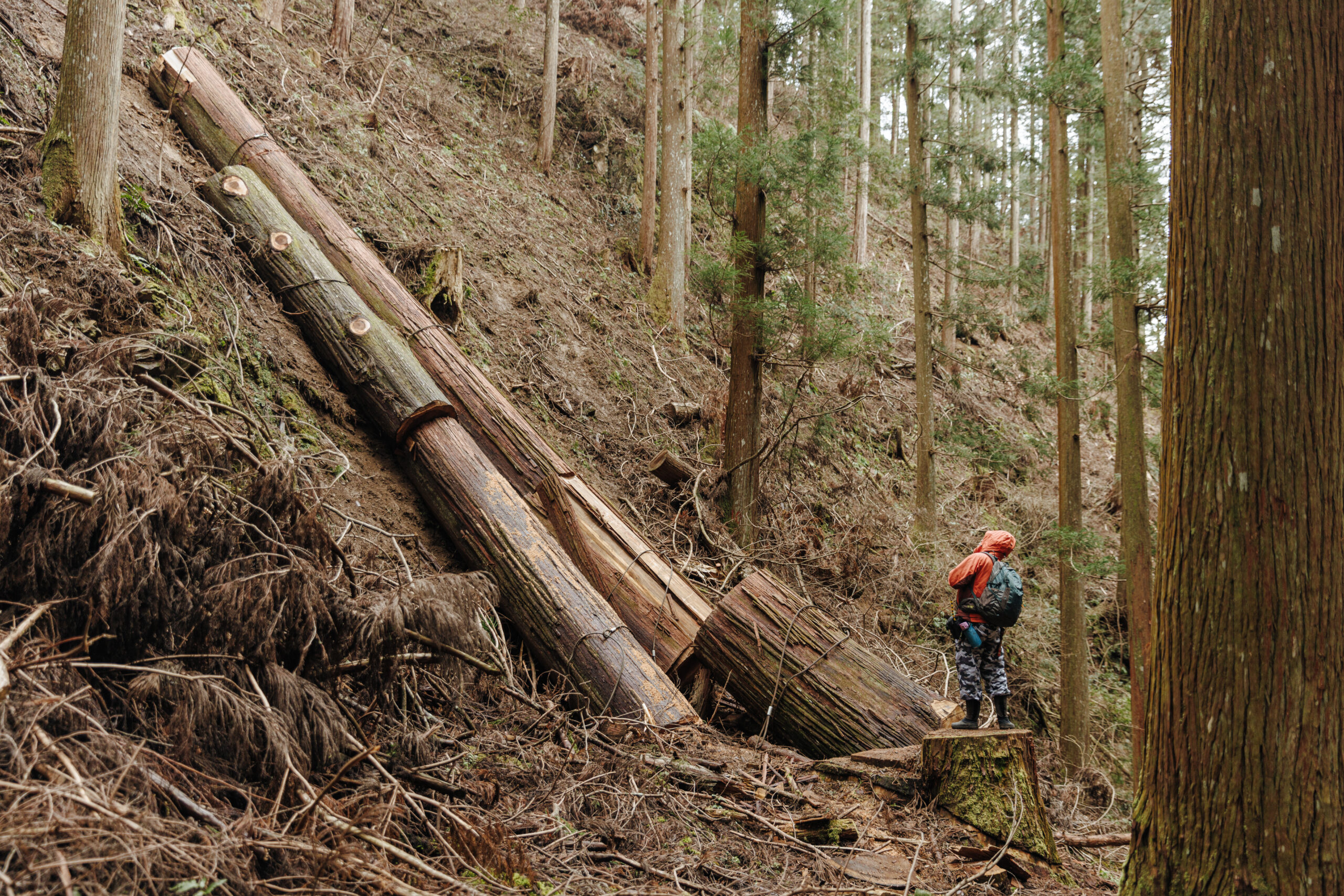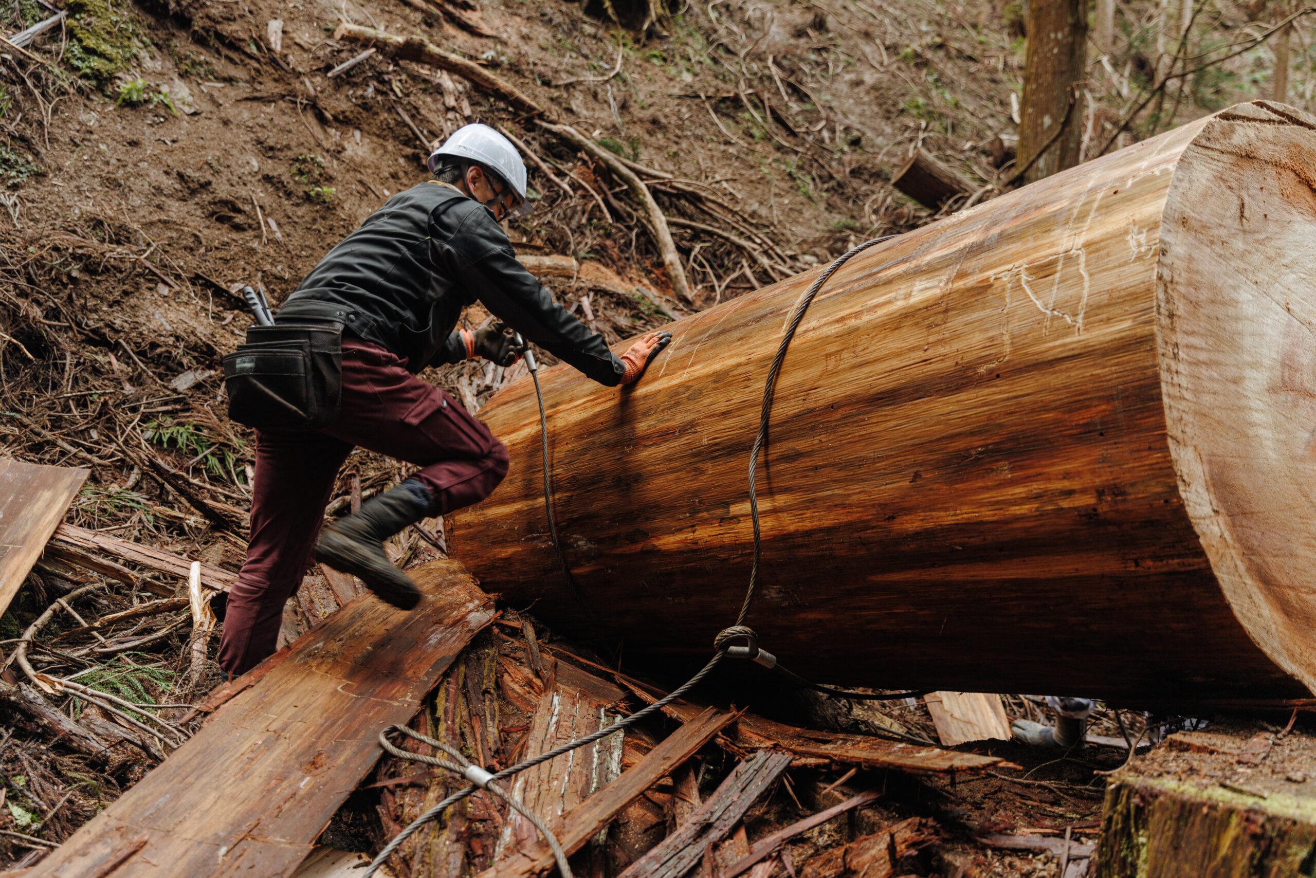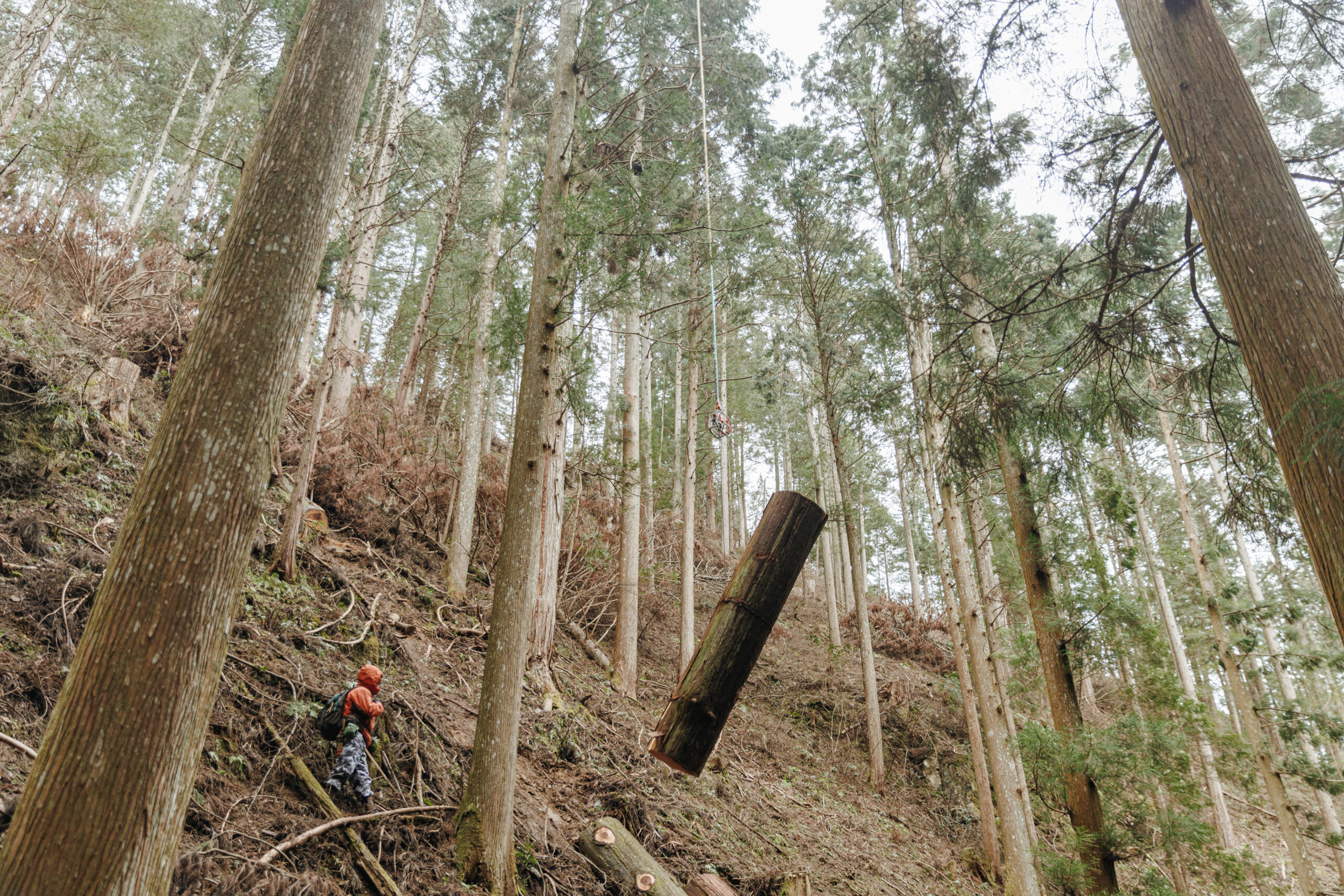 そして、何より山を傷つけないことが大きなメリットだと思います。伐り出す時に他の木に当たってしまわないように気をつけさえすれば、あとはヘリで上に吊り上げれば良いだけなので、残存木(ざんぞんぼく)に与える影響が少ない。そういったことが非常に大きなメリットだと思います。