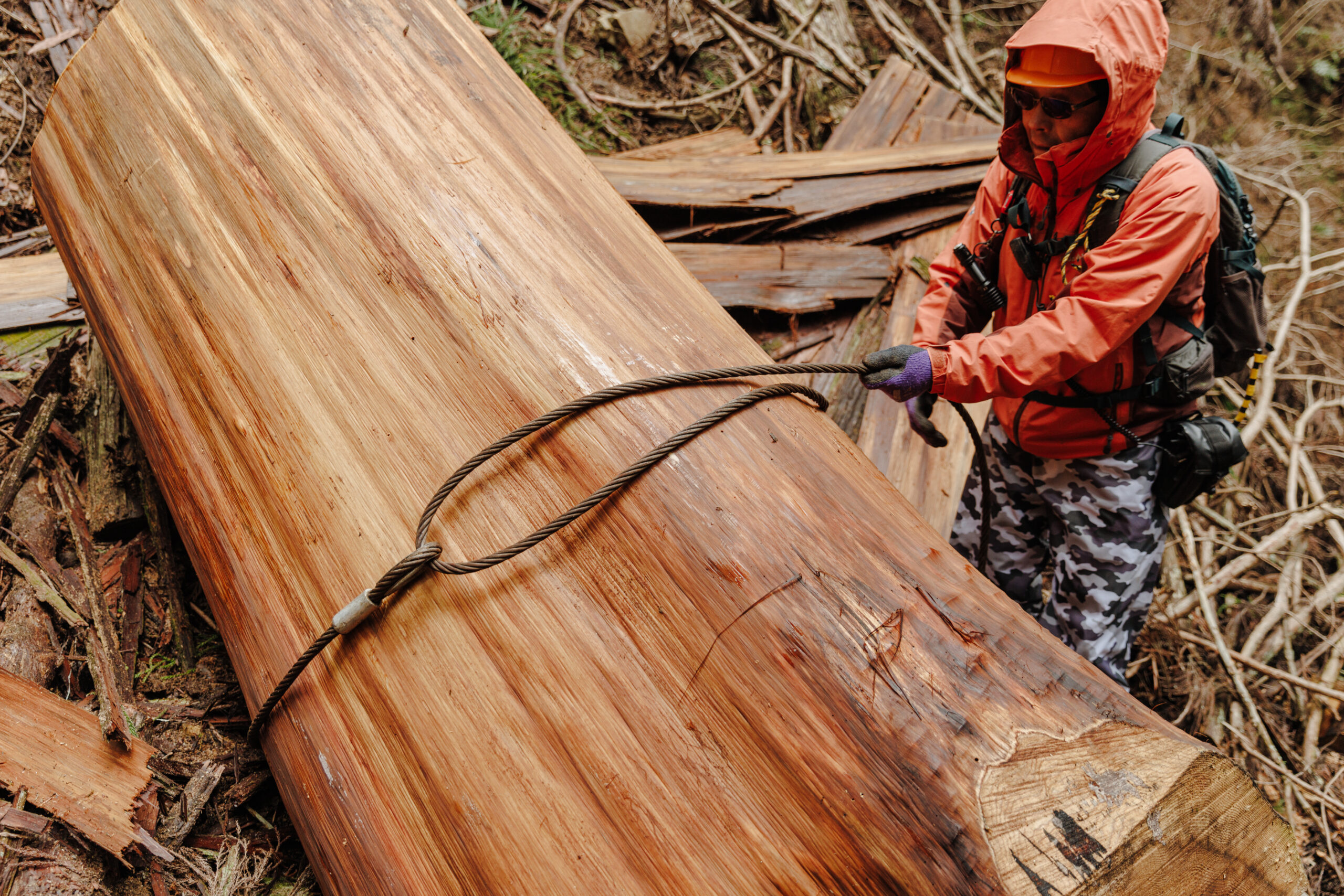 伐倒する前には木を見て周囲を確認し、どちらに倒すかを相談し決めます。どちらに倒すかが重要で、安全の確保を最優先しつつ、他の木を傷つけないように、そしてヘリコプターの荷物をつくるにはどちらに倒して荷物をまとめるのが効率的かと、先々のことまで考えながら行います。荷物をつくる上で、軽すぎると利益が減る。逆に重すぎると運べない。そのため、軽すぎず重すぎない加減が大切になります。また、ワイヤーをかける場所もとても大事で、途中でワイヤーが滑ったりして木材が落下すると大きな事故にも繋がりかねません。