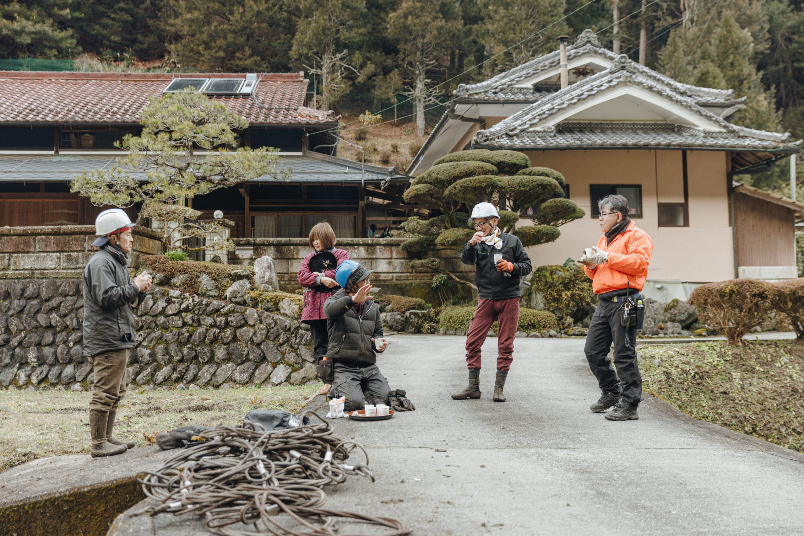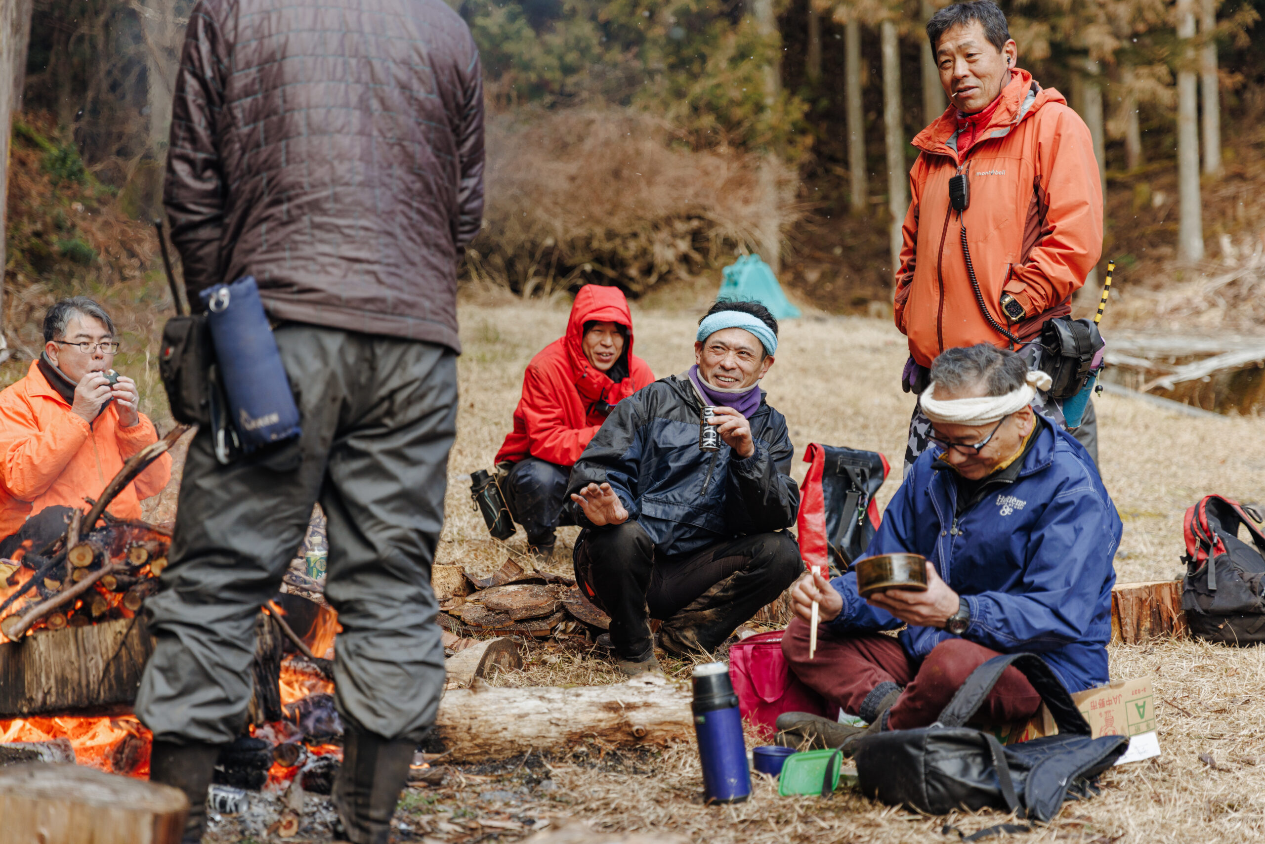 お昼の休憩は、各自が持ってきた弁当を広げ仲良く談笑しながら食べるのが日常。寒い冬は薪を焚いて、暖を取る。時にはそこに地域の人が温かいお茶を差し入れしてくれたり、協力会社のヘリコプターの操縦者も顔見知りで、会社組織を超えて、人の輪でチームワークを築いていくことが仕事をスムーズにすると言います。作業中の緊張から離れ、和気あいあいと楽しい空気が心地よさを感じさせてくれました。