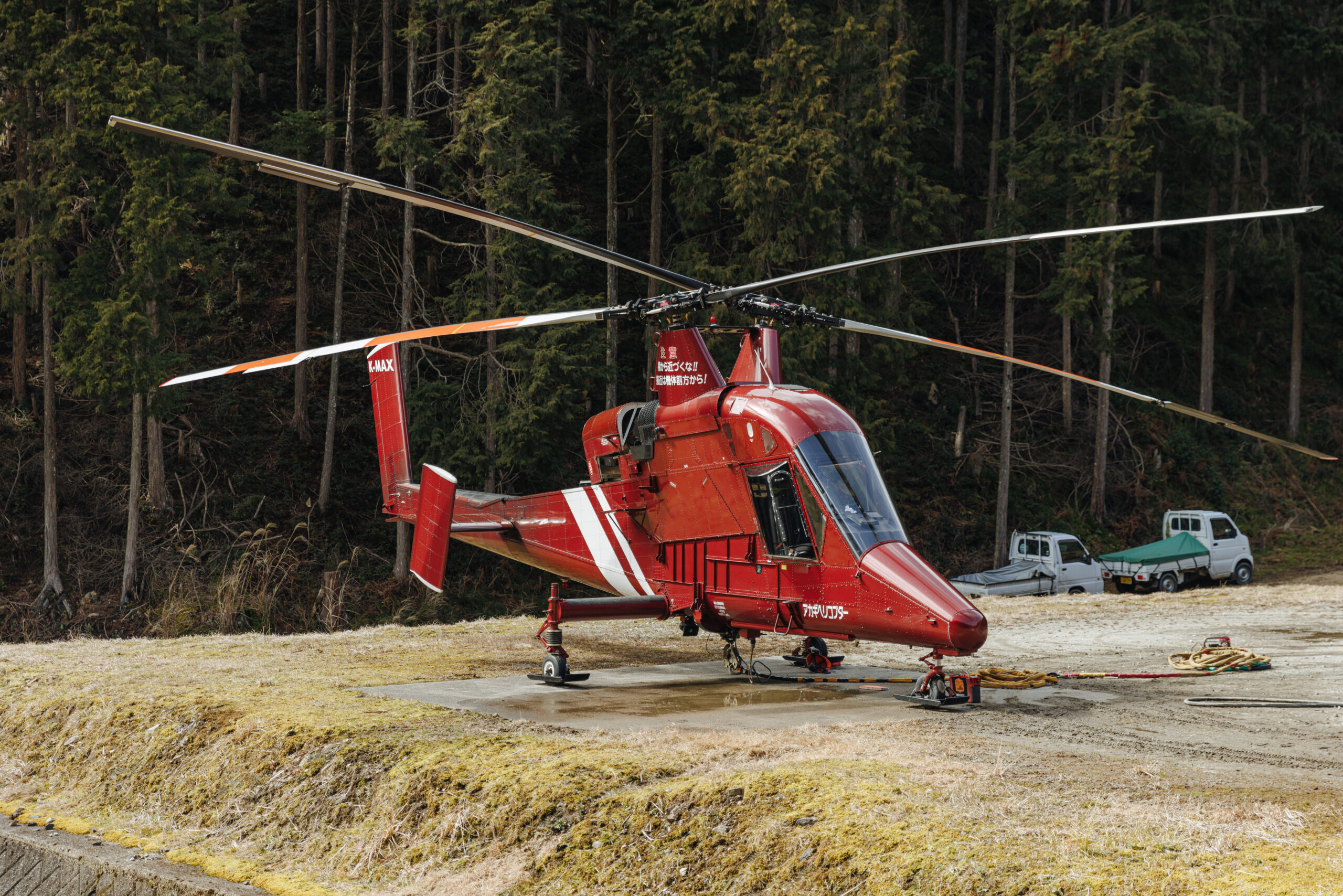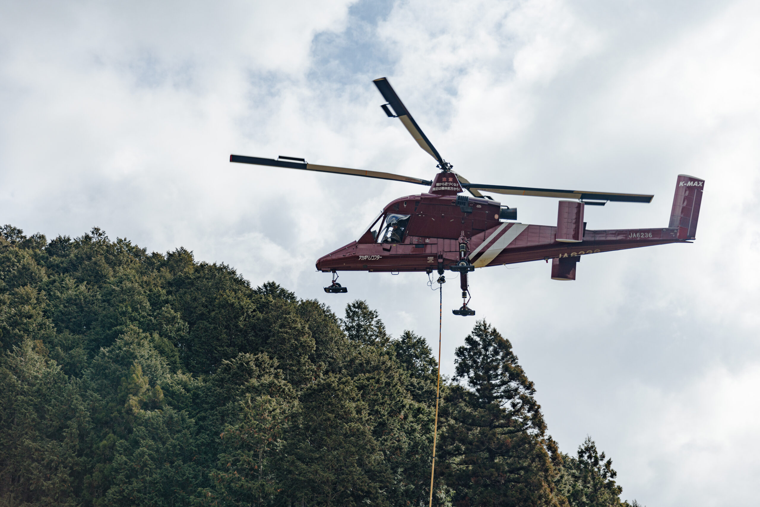 取材日に飛んでいたヘリコプターは一度に最大約2tもの木材を運ぶことができる。