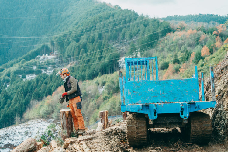 数日前に山間部には積雪があり、ようやく晴れ間がのぞいたある日、上山拓己さんは我々を四駆に乗せ、驚くほどの急斜面をグングンと登ります。まだ雪が残る現場に到着すると黒滝村森林組合のみなさんが黙々と作業をされていました。「就職前に現場を見学した時、こんな道を運転できるわけない!と思っていましたが、慣れるものですね」アウトドア系アパレル販売の仕事から林業の世界に入り5年。アウトドアを愛する上山さんが考える林業とご自身の活動のお話をうかがいました。