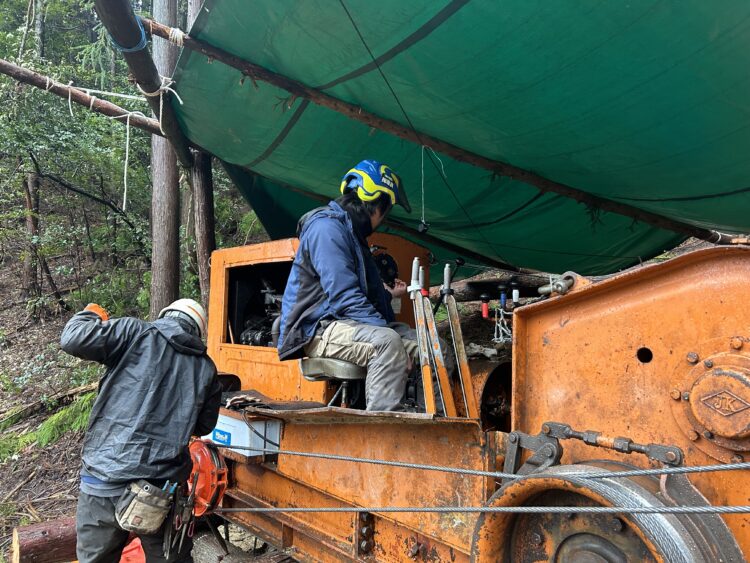 かつて奈良県は、ヘリコプター集材を出材方法の主流にしていて、ヘリコプター会社が5社常駐していましたが、多くは撤退され、今では1社になりました。1社となるとコストもかかり、山林所有者が木を出したいと思っても、自由に出せなくなってしまったという現状があります。また、作業道作設に関しては、急峻な地域では道をつけたところで山崩れが起きたり水害に遭ったりすることもあり、林業の出材方法としては良いが、全ての土地に合うという訳ではありません。そこで、より安全にできる架線集材の方法を探っていたところ、県が所有するスイス式の架線機械があるということで、私たちが購入した国有林の立木で取り組むことになりました。奈良県フォレスターアカデミーの協力もあり、地域の素材生産者さんにも見てもらい、実践練習や交流を行いました。また、機械を使うだけでなく、メンテナンスもできなければいけないということで、1週間のスイスでの研修も行いました。新しい方法が使えそうであれば普及させることで、より簡単に山での架線作業がやりやすくなるのではないかと。まずは、一歩目を踏み出さないと、始まらないので県の力を借りて一緒にやらせていただきました。