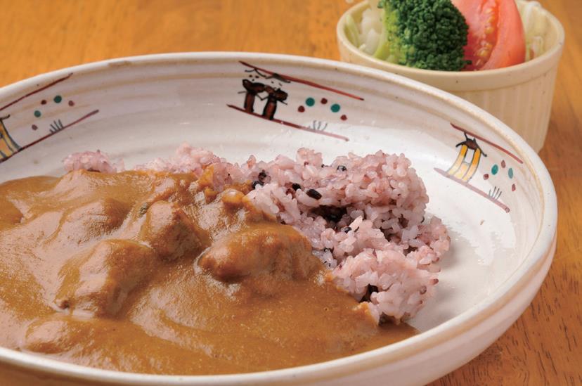 「奈良のうまいもの」のひとつ、黒米カレーはサラダ付き(650円)。辛さは控えめ。
