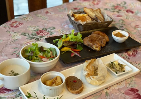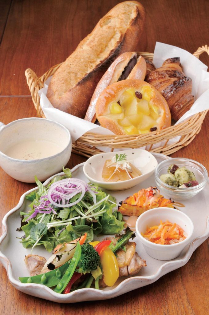自家製パンの食べ放題が付くランチ(1000円〜)も人気だが、朝の爽やかな空気のなかで「モーニングセット(500円)」をいただいたり、昼下がりにはケーキやスコーン、サンドイッチが付く「英国式アフターヌーンティーセット(14時30分〜、1500円)」にも注目してほしい。風が心地よい季節には、テラス席でゆっくりと時を過ごすのがオススメ。