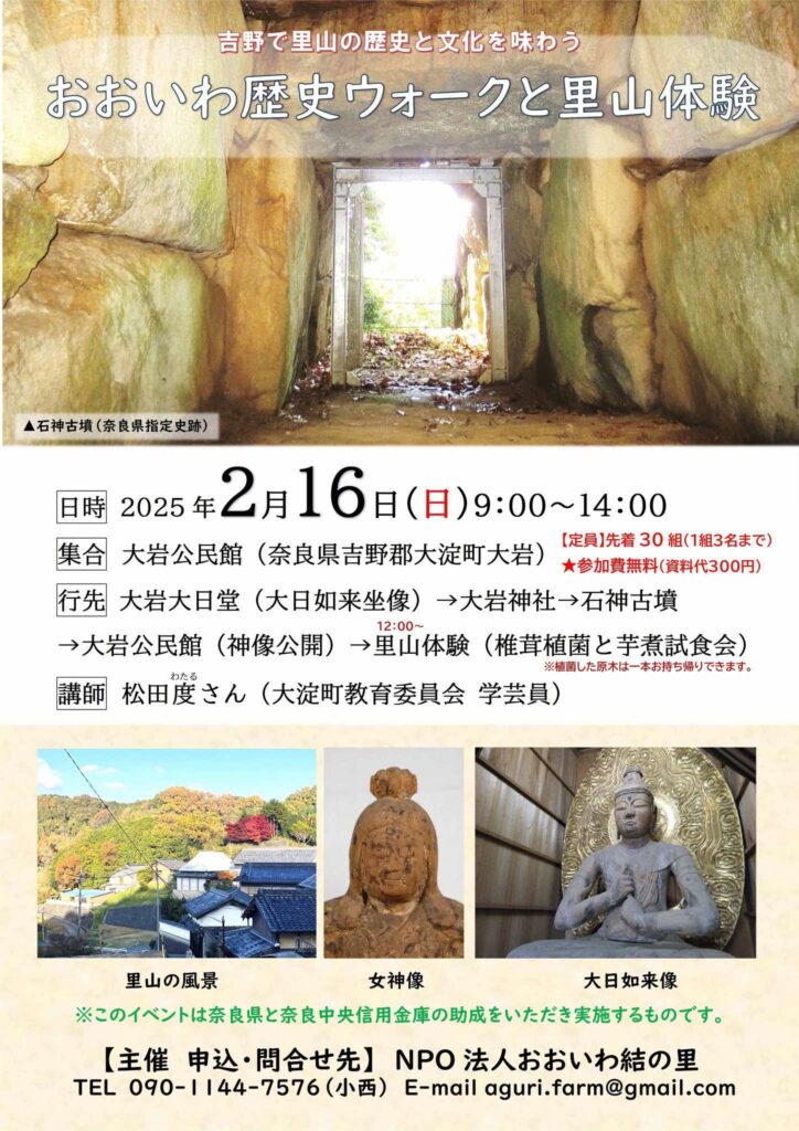 - 行先:大岩大日堂(大日如来坐像)→大岩神社→石神古墳→大岩公民館(神像公開)→里山体験(椎茸植菌と芋煮試食会)