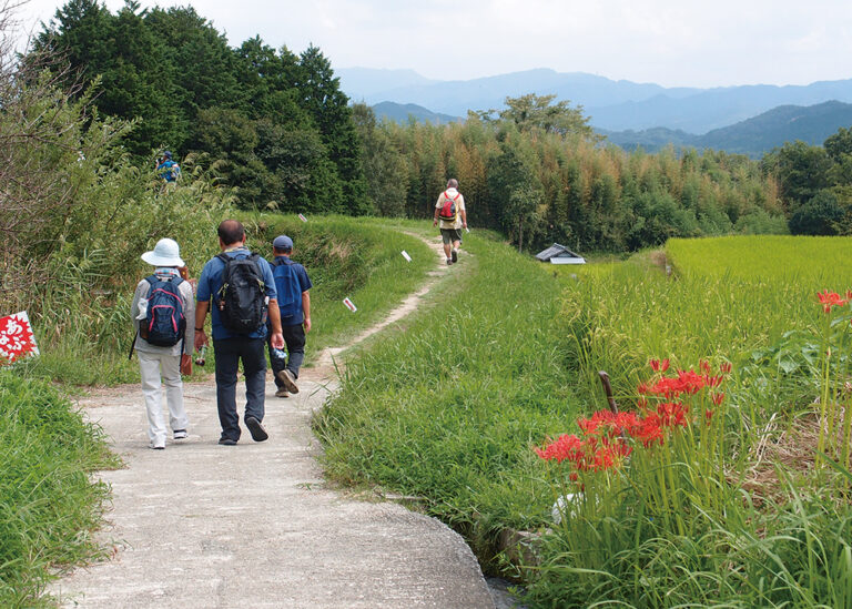 金剛山と葛城山の山裾を南北に走る古道を「葛城古道」と言います。のどかな田園風景の中に、由緒ある神社仏閣や葛城王朝以来の史跡、農耕文化の跡が残されています。
