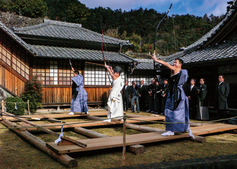 毎年1月8日、「景徳寺」の裏庭で行われる「弓矢祭り」。この地に住みついた平家一門が再興を願い、練武を行っていたことから始まったと言われています。県指定の無形民俗文化財。