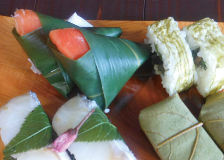 「大台ヶ原」に生える笹の葉をモチーフに、シャケの切り身とシャリを包んだ笹巻き寿司。「ゐざさ」は、笹をまとった大猪の神様「ゐざさ王」に由来します。