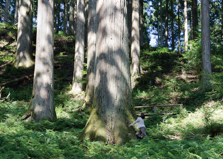 江戸時代初期に植林された、現存する日本最古の人工林のひとつ。面積約3,700m²の山肌に、樹齢260年~400年の杉・檜が林立。文化庁「ふるさと文化財の森」に県内で初めて選ばれています。