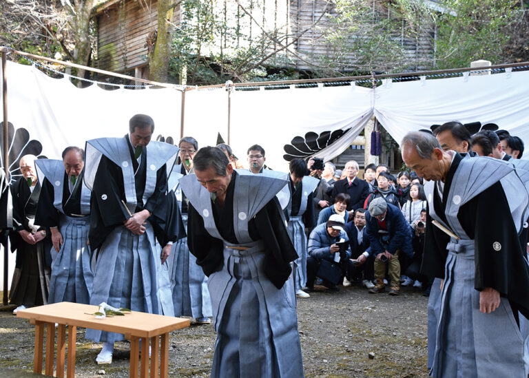 悲運の最期を遂げた南朝最後の皇子・自天王を偲び、毎年2月5日に遺品の兜(重要文化財)などを拝する朝拝式が行われています。500余年、一度も欠かさず行われている式典です。