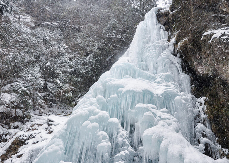 高さ約50m、2段になって水が勢いよく流れ落ちる「御船の滝」は、冷え込みによっては、見事な氷瀑になることも。その姿は「文殊菩薩」を現すとも言われ、知恵を授ける滝として伝えられています。