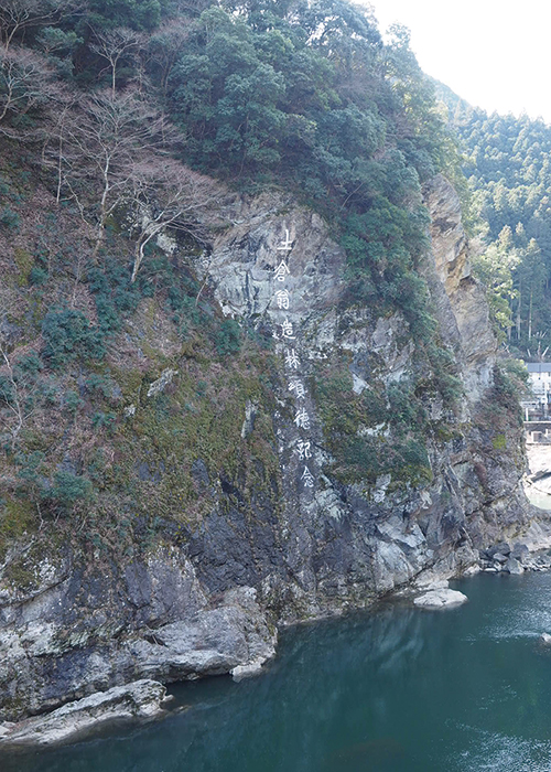 木材の生産・搬出コストの低減を図ると共に、従事者たちの労働・生活環境の整備も進め、新たな需要を掘り起こすため、吉野優良材のプロモーションにも力を入れています。平成27年には、村と森林組合など村内にある4つの林業関係団体が連携し、「吉野かわかみ社中」を設立。川上産吉野材の生産から販売までの供給一貫体制の確立を推進しています。大滝集落の対岸には「吉野林業」を広めた「日本林業の父」土倉庄三郎の磨崖碑があります。