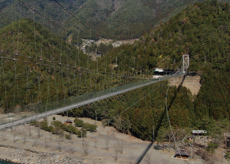 村を縦断するように流れる十津川に架けられた、長さ297m、高さ54mの巨大吊り橋。昭和29年に集落の住民の力で架けられ、今も重要な生活道路として使われています。