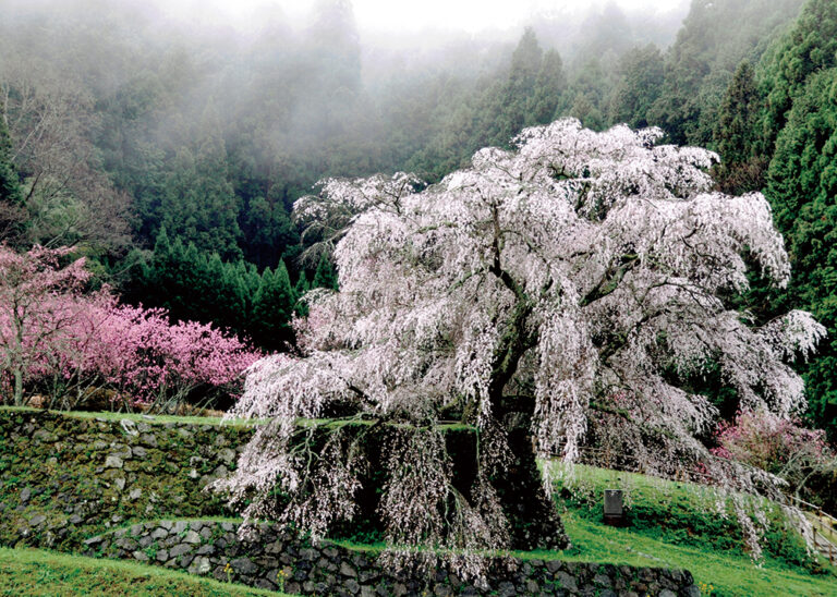 大宇陀にある巨大な枝垂れ桜。樹齢300年とも言われ、高さは13mにもなります。戦国武将・後藤又兵衛が僧侶となり、この地で生涯を終えたという伝説にちなんで、「又兵衛桜」と呼ばれています。