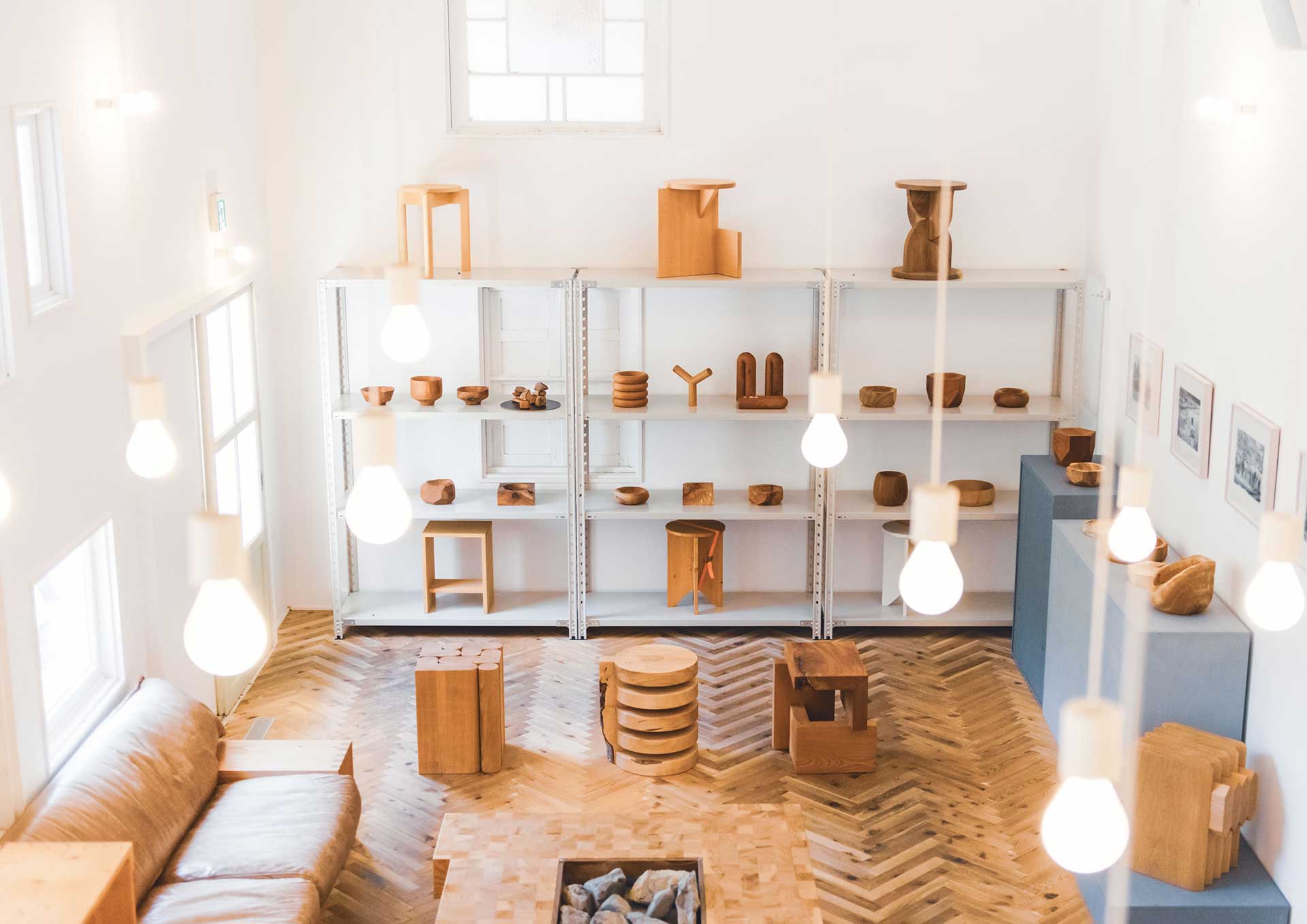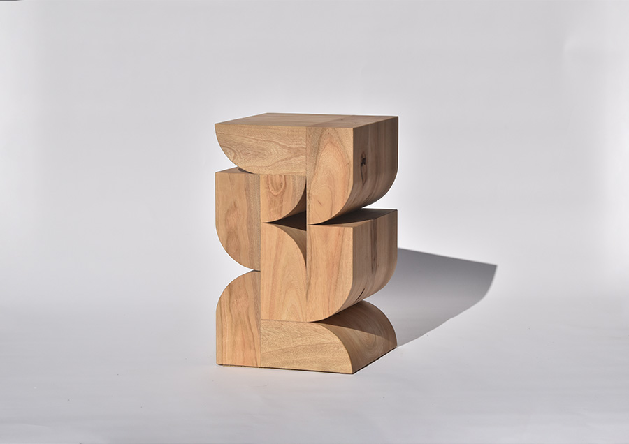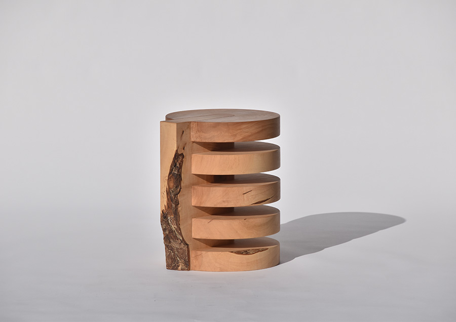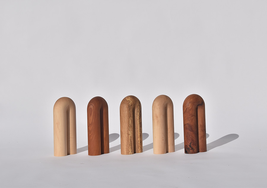 村尾:木製の家具と木の器という二つの柱で作っています。どちらも、基本的には自分が欲しいと思う物、実際に使いたいと思うものをデザインして作っていて、それ以上でもそれ以下でもありません。家具の特徴は、ものすごくシンプルな形状です。例えば、丸脚のダイニングチェアの場合、脚の一つ一つにわざとらしいシェイプをかけず、同じ35mmの直径の丸棒を繋いでつくったり、ソファでもすごく簡単な図形で構成されていたり。余計なことをしていないものが好きなので「こんなのがあったらかっこいいんじゃないか」という物を作っています。器は、木目が特徴的な物を積極的に使って制作しています。節だったり皮だったりという特殊な部分も積極的に器の一部に入ってくるように意図的に木取りをしているので、形も特徴的で、存在感のある器だと思います。ノコギリで切った切断面をそのままテクスチャーとして残しているものもあれば、細かい目のサンドペーパーを当てて光沢を出してみたり、両者を併せて使うことでコントラストを出したりしています。実用的なものもあれば、オブジェに近いような形のものもあります。もちろん、器として使ってもらいたいと思いますが、空間に置いておくだけで存在感があるような器を目指して作っています。