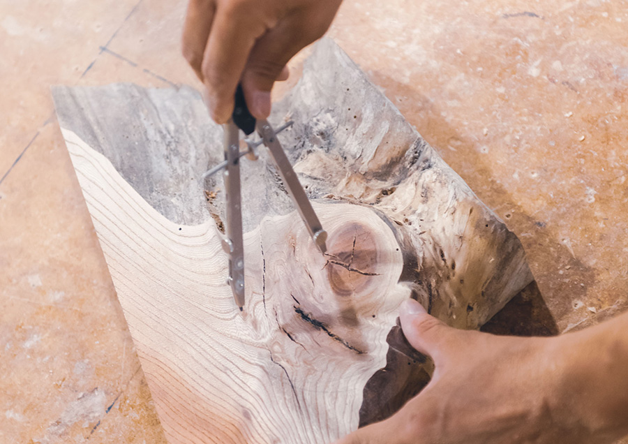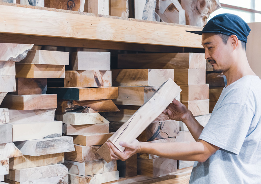 村尾:僕が家具で使っている木はほとんどが地場のものではありません。なぜなら、木材の産地を限定してしまうと、手に入る木材が限定されてしまうからです。自分が「この家具にはこの木を使いたい」と思ったら産地にこだわらず使っています。でも、僕がここで作っている製品は全て、mad in 十津川です。一方で器には地場の木を結構使っています。特殊な木目の物を使いたいので、やっぱり自分の目で見て「これいいじゃん」と思える物を選べるのは大きいですね。林業をやっている方から「こんな木が出たよ」と教えてもらうことや、「こんな木が倉庫に眠ってるけど見に来ない?」と声をかけてもらうこともありますし、製材所の人に声をかけておくと「こんな木が入ったよ」という情報も入ってきます。これらは地元だからこそできることですね。