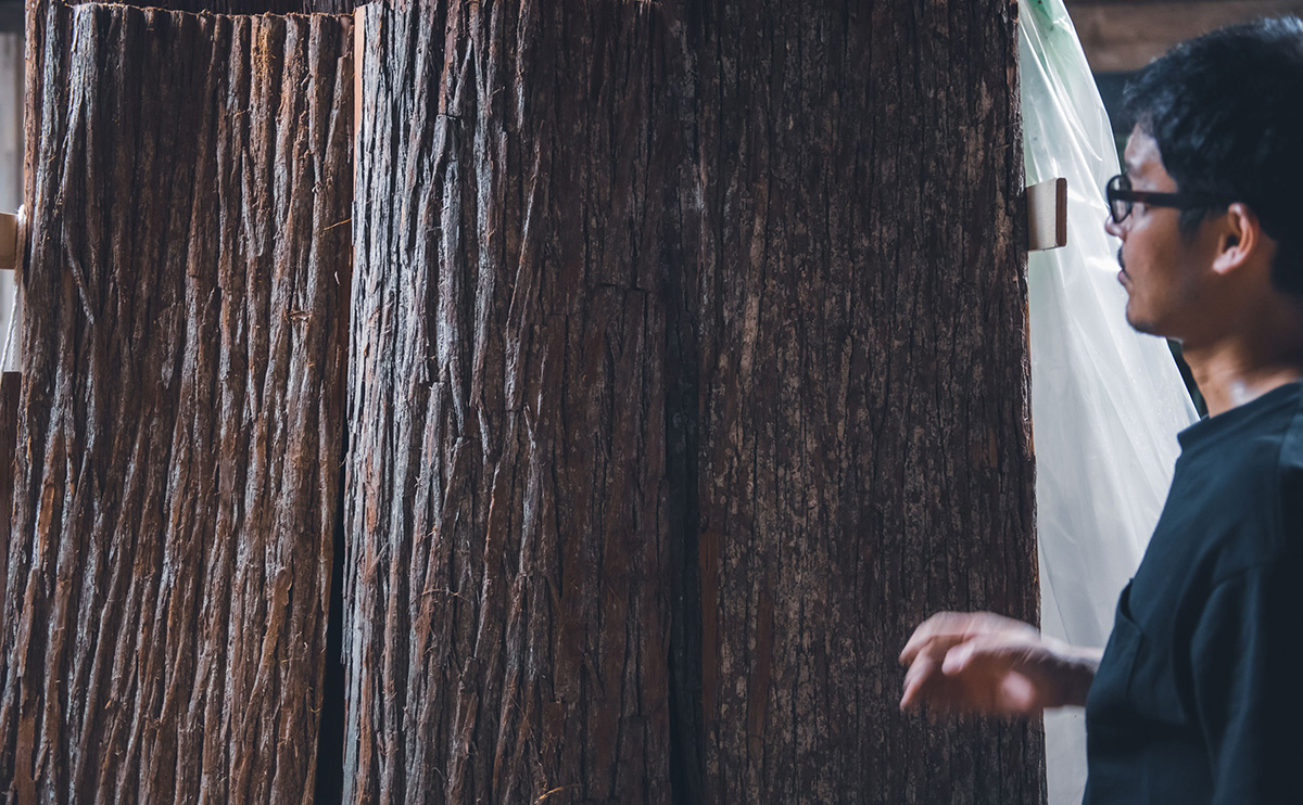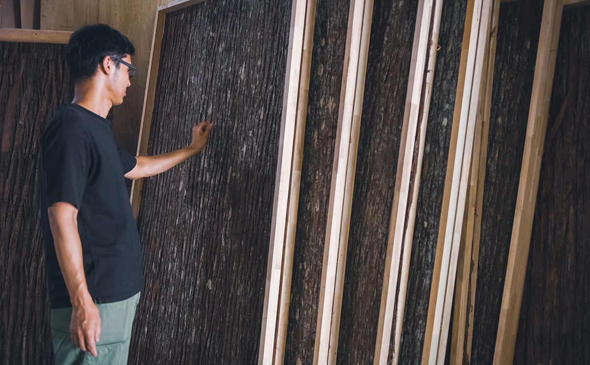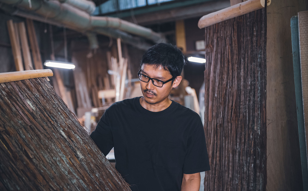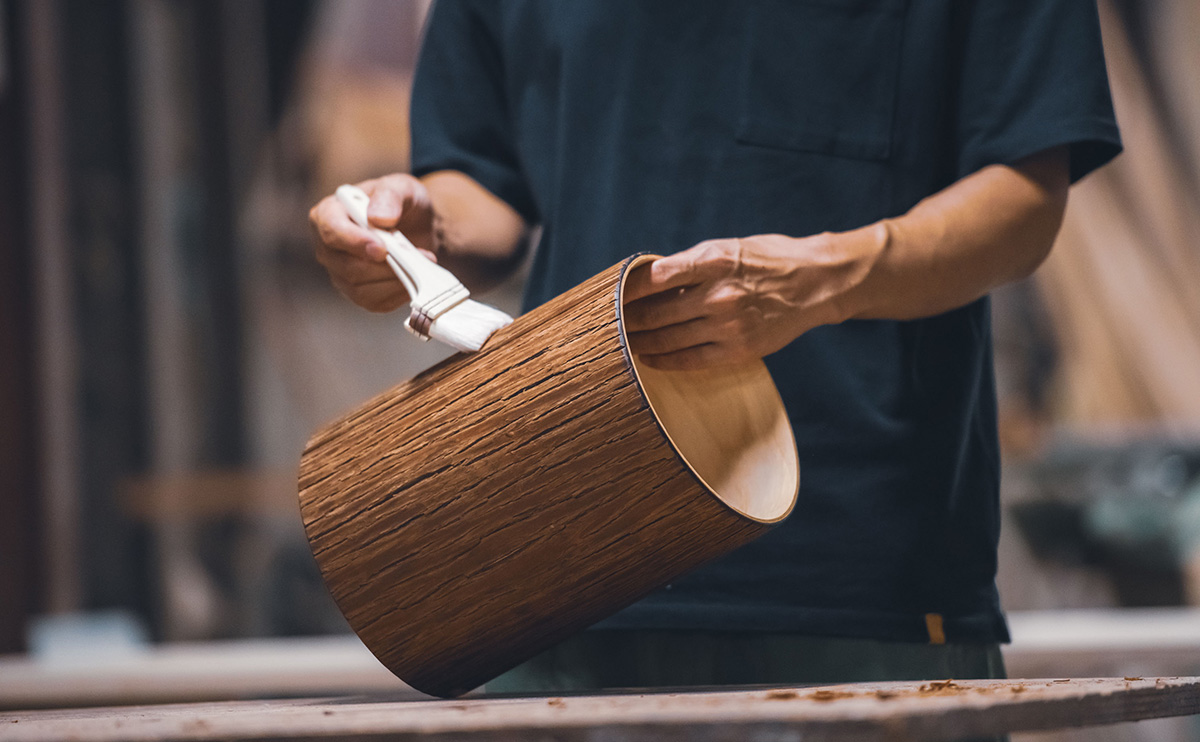高野家具は奈良県吉野郡下市町にあります。下市町は吉野郡の北西に位置し、古くから吉野山地と大和平野を結ぶ交通の要衝、市場町として栄えてきました。全体の約80%を緑の山々が占め、澄み切った清流である秋野川、丹生川に彩られた自然豊かな土地です。高野家具は、廃棄されていた杉皮に新たな価値を見据え、自然からの恵みを無駄にせず、その魅力を広く伝えていく製品を生み出しています。