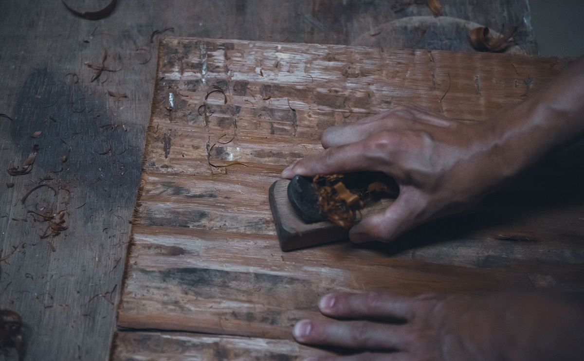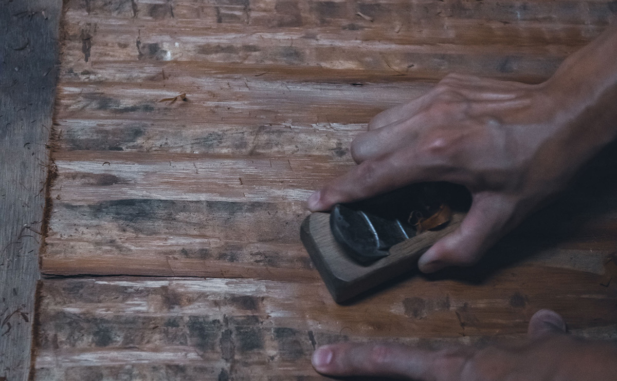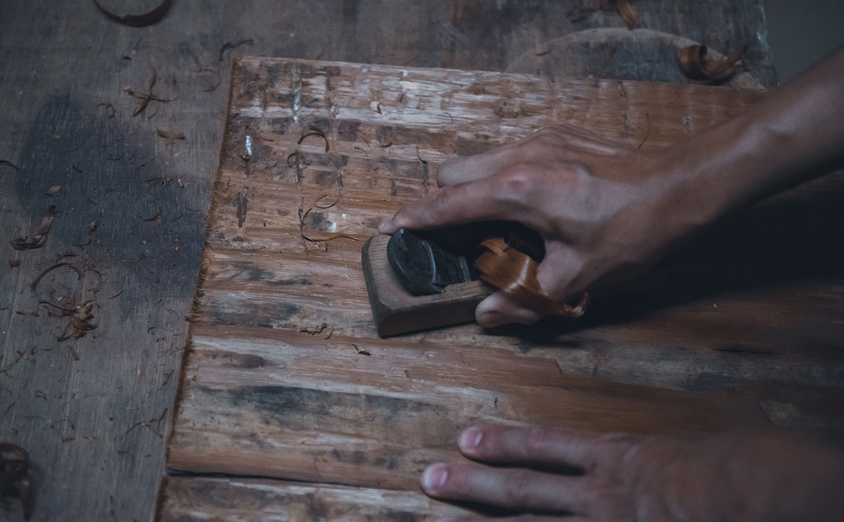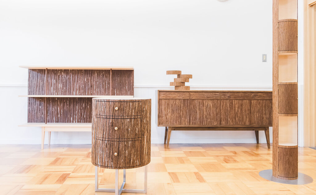 高野家具は奈良県吉野郡下市町にあります。下市町は吉野郡の北西に位置し、古くから吉野山地と大和平野を結ぶ交通の要衝、市場町として栄えてきました。全体の約80%を緑の山々が占め、澄み切った清流である秋野川、丹生川に彩られた自然豊かな土地です。高野家具は、廃棄されていた杉皮に新たな価値を見据え、自然からの恵みを無駄にせず、その魅力を広く伝えていく製品を生み出しています。